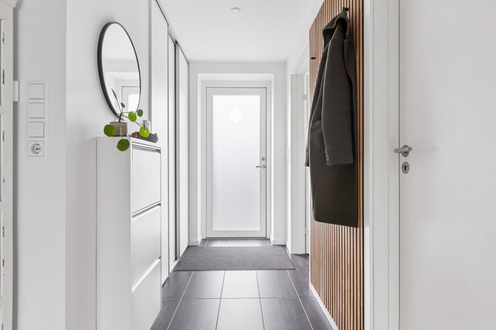 Indenfor byder rækkehuset på en separat entré, et lækkert stort bryggers/gæstetoilet, en rummelig og lys stue, hvor I kan slappe af og tilbringe kvalitetstid med familie og venner. De store vinduer bringer masser af naturligt lys ind i rummet og skaber en behagelig atmosfære. Køkkenet ligger i åben forbindelse med stuen og er udstyret med moderne apparater og hvide, grebsfrie skabe. Her kan måltiderne tilberedes, imens der hyggesnakkes med familien om middagsbordet eller i sofagruppen.