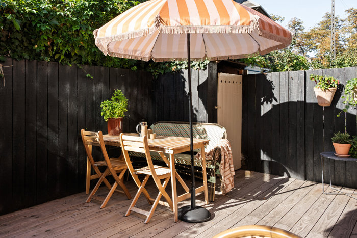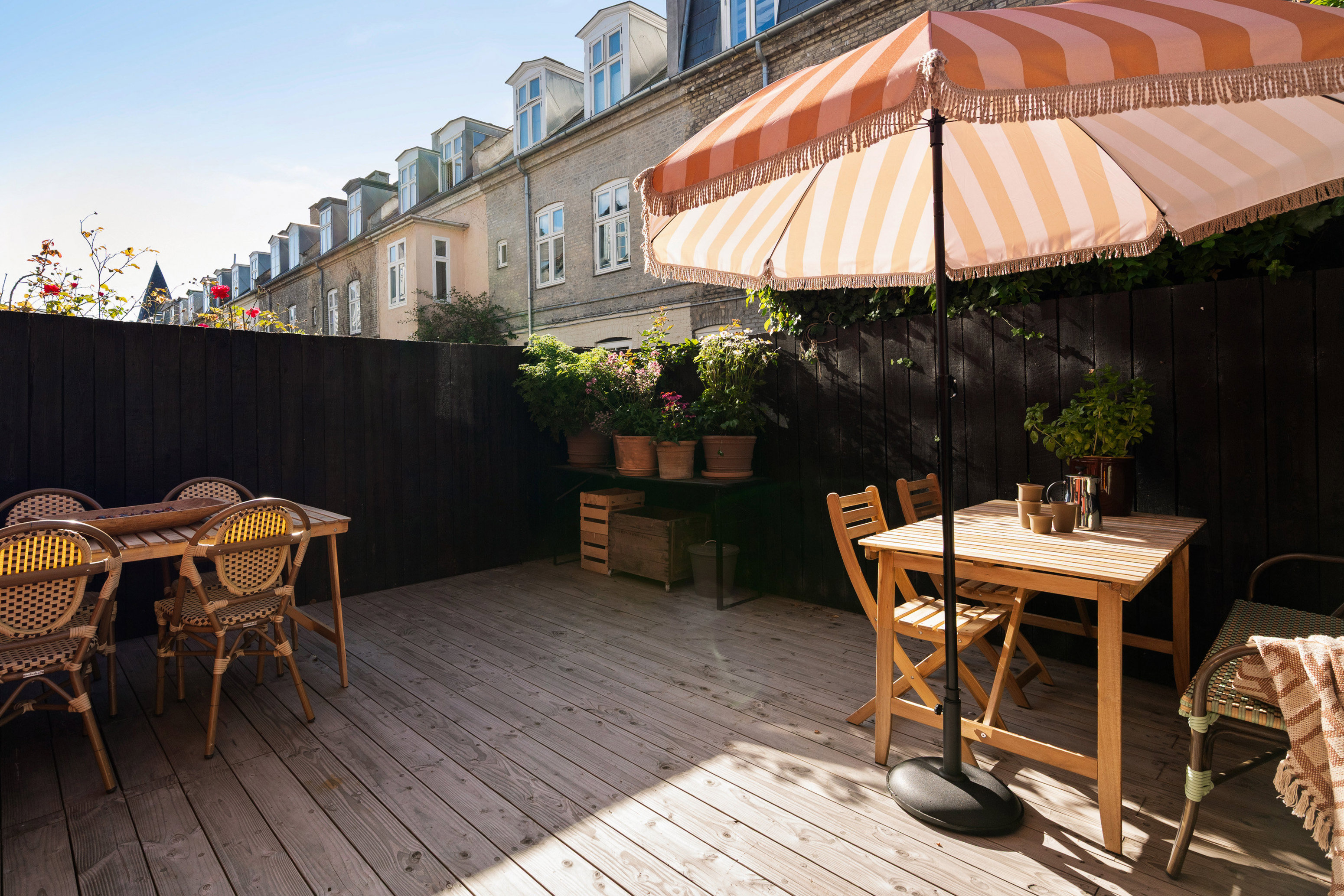 Allerede ved ankomsten mærker du den særlige stemning: Den charmerende, brostensbelagte forhave giver et diskret strejf af parisisk elegance, mens baghaven med sin smukke træterrasse indbyder til lange sommermiddage og et glas vin i aftensolen.