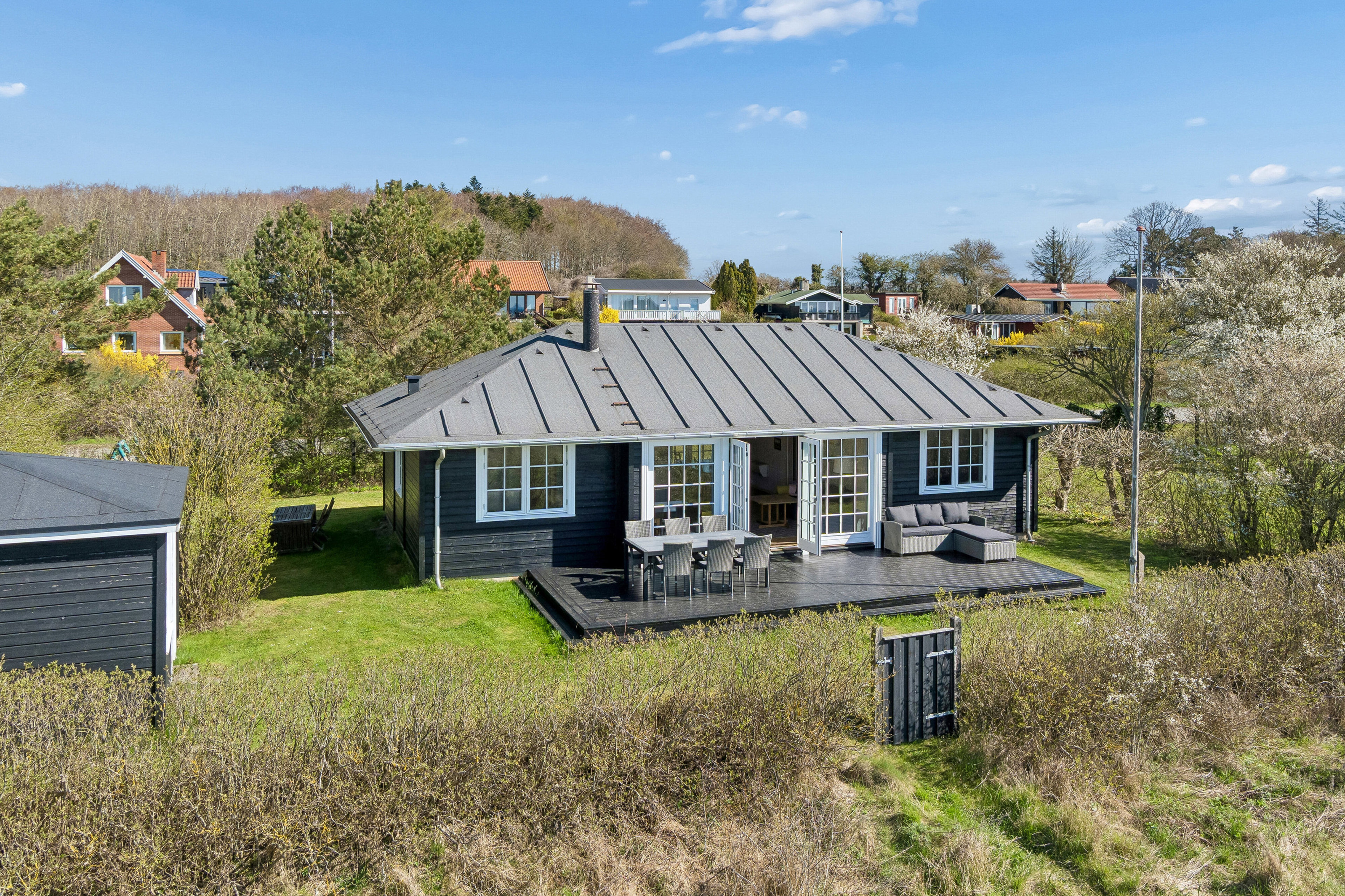 Fra huset er der frit kig over det åbne landskab ned mod kysten, så naturen altid er nærværende, uden at du giver køb på privatlivet. Haven er skøn og omkranset af beplantning, der skaber en behagelig afskærmning og samtidig bevarer udsigten mod det fredede område. Her finder du både ro, læ og luft omkring huset samt en stærk visuel forbindelse til landskabet, der gør det oplagt at trække ud, når vejret tillader det.