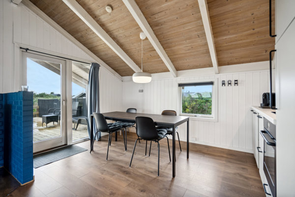 Spisestue med udgang til terrasse mod syd, øst og vest, og flot kig ud over de åbne vidder mod fjorden.