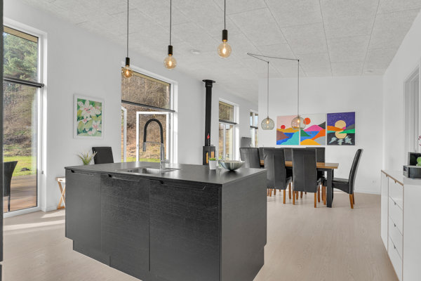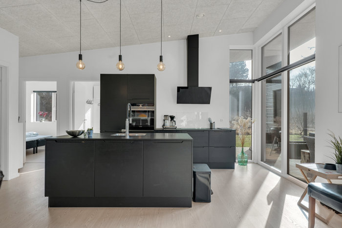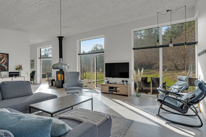 Indenfor fortsætter den bekvemme linje med gulvvarme i samtlige rum, gennemgående Troldtekt-akustiklofter og et ventilationsanlæg, der holder indeklimaet rart – også når huset er fyldt. Lysindfaldet spiller en hovedrolle, og de store vinduespartier trækker skoven helt ind i opholdsmiljøet. Samlingspunktet ligger naturligt i køkken/alrummet, hvor I får et stilrent Invita-køkken med sorte fronter og kogeø. Der er åben forbindelse til stuen, som åbner sig som et stort hjerterum med gulv-til-loft vinduer, brændeovn og direkte udgang til terrassen – en enkel opskrift, der bare virker.