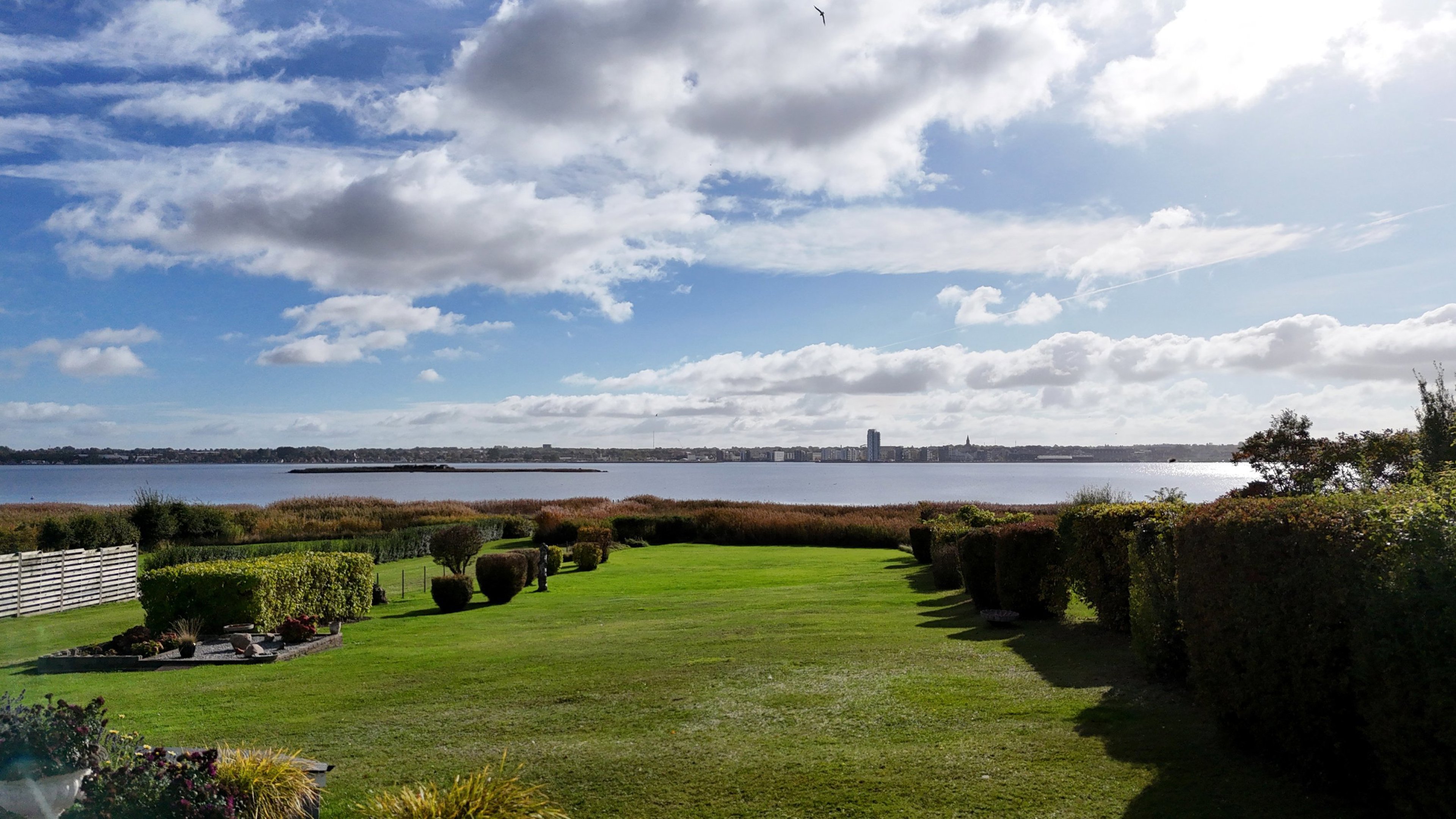 Indgangen sker via en stor og lys entré med glaspartier og rigelig opbevaringsplads. Herfra er der adgang til et rummeligt og velholdt køkken i delvis åben forbindelse med stuen. Stuen imponerer med loft til kip, ovenlysvinduer og direkte udgang til en solrig sydvendt træterrasse – med fjorden som nærmeste nabo.