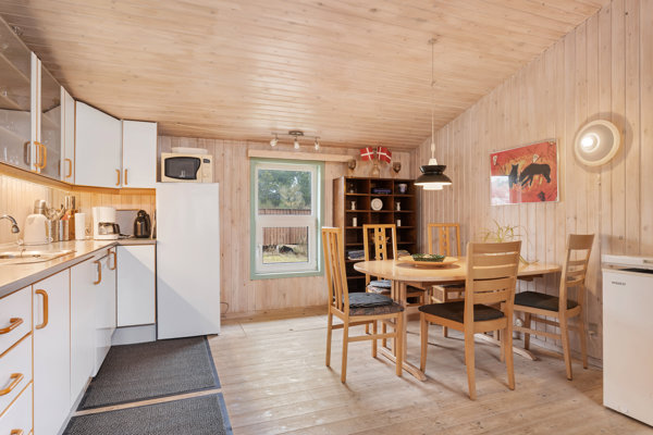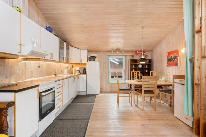 Indenfor venter et rummeligt og velfungerende fritidshus med plads til både familie og gæster. De tre store værelser giver gode indretningsmuligheder og gør huset velegnet, hvad enten det skal danne rammen om afslappende weekender, lange ferier eller hyggelige samvær med venner. Badeværelset byder på sauna, som sætter prikken over i’et og tilfører en ekstra følelse af velvære efter en dag ved vandet eller en frisk gåtur i klitterne. Husets hjerte er det store køkken/alrum i åben forbindelse med den indbydende stue. Her er plads til både madlavning, samvær og lange måltider, mens opholdsrummet indbyder til afslapning med udsigt til den omgivende natur. De store glaspartier giver ikke blot et smukt lysindfald, men skaber også en særlig lethed i rummene, hvor man hele tiden fornemmer den naturskønne beliggenhed lige udenfor.