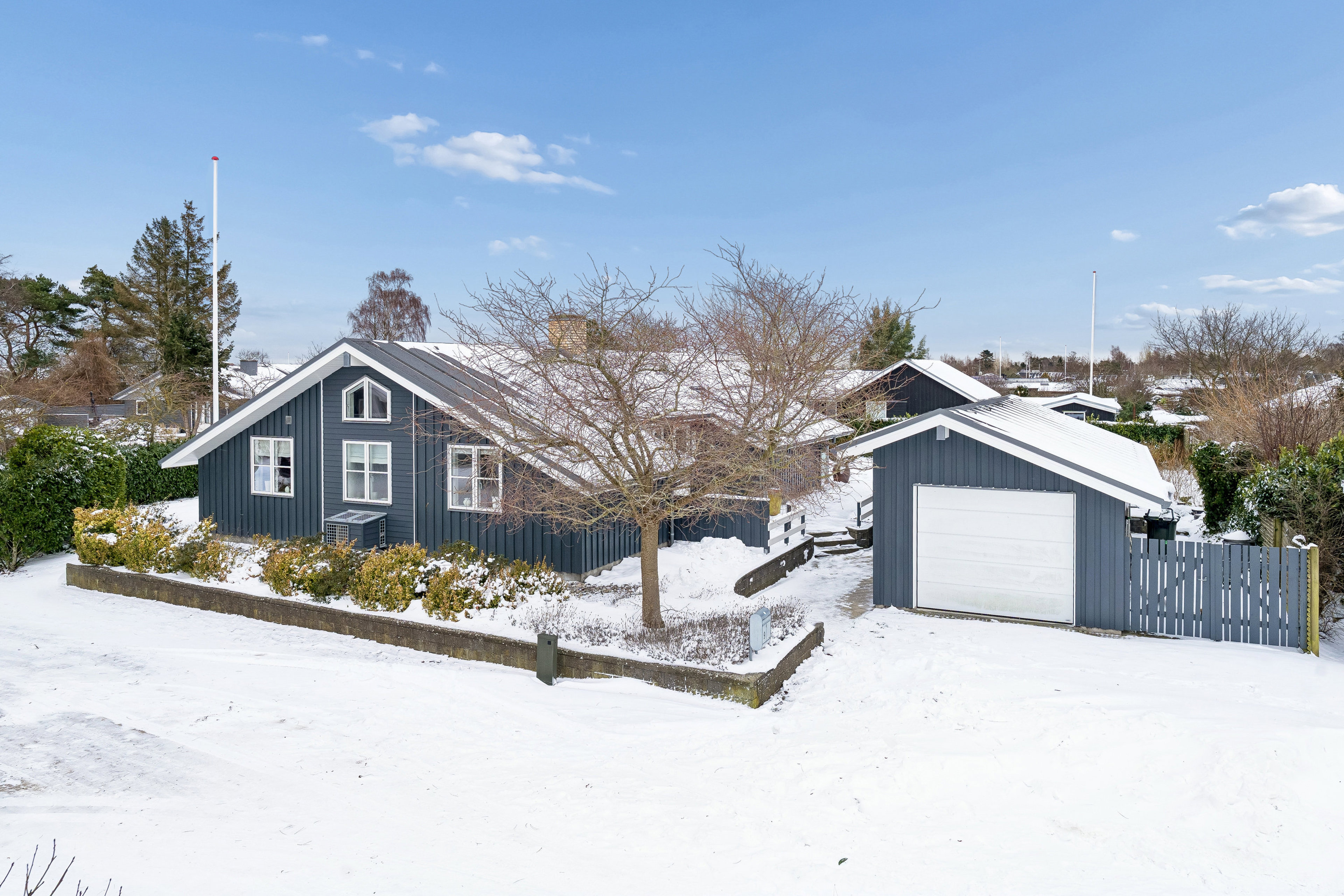 Den højloftede og isolerede garage med støbt gulv og elport giver gode opbevarings- og aktivitetsmuligheder, hvad enten det er til bil, bådudstyr eller hobbyprojekter. Det isolerede anneks med akustikloft og plankegulv åbner for ekstra anvendelsesmuligheder som gæsteafdeling, hjemmekontor eller kreativt rum.