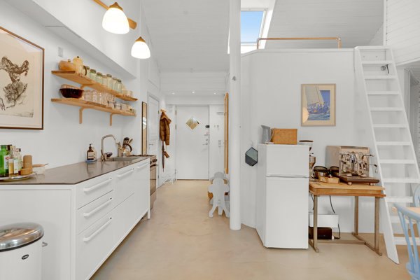 I det store køkken-/alrum og stue er der åbnet op til kip, hvor man også har lavet ovenlys-vinduer samt vinduer i gavlen, for at sikre et lyst, men stadig privat rum. Her findes også en god hems med plads til en madras. 3 gode og rummelige værelser, hvoraf det ene også er med hems. Stort badeværelse med en vaskemaskine og indmuret badekar, samt separat bruseniche udformet med inspiration fra et skib.