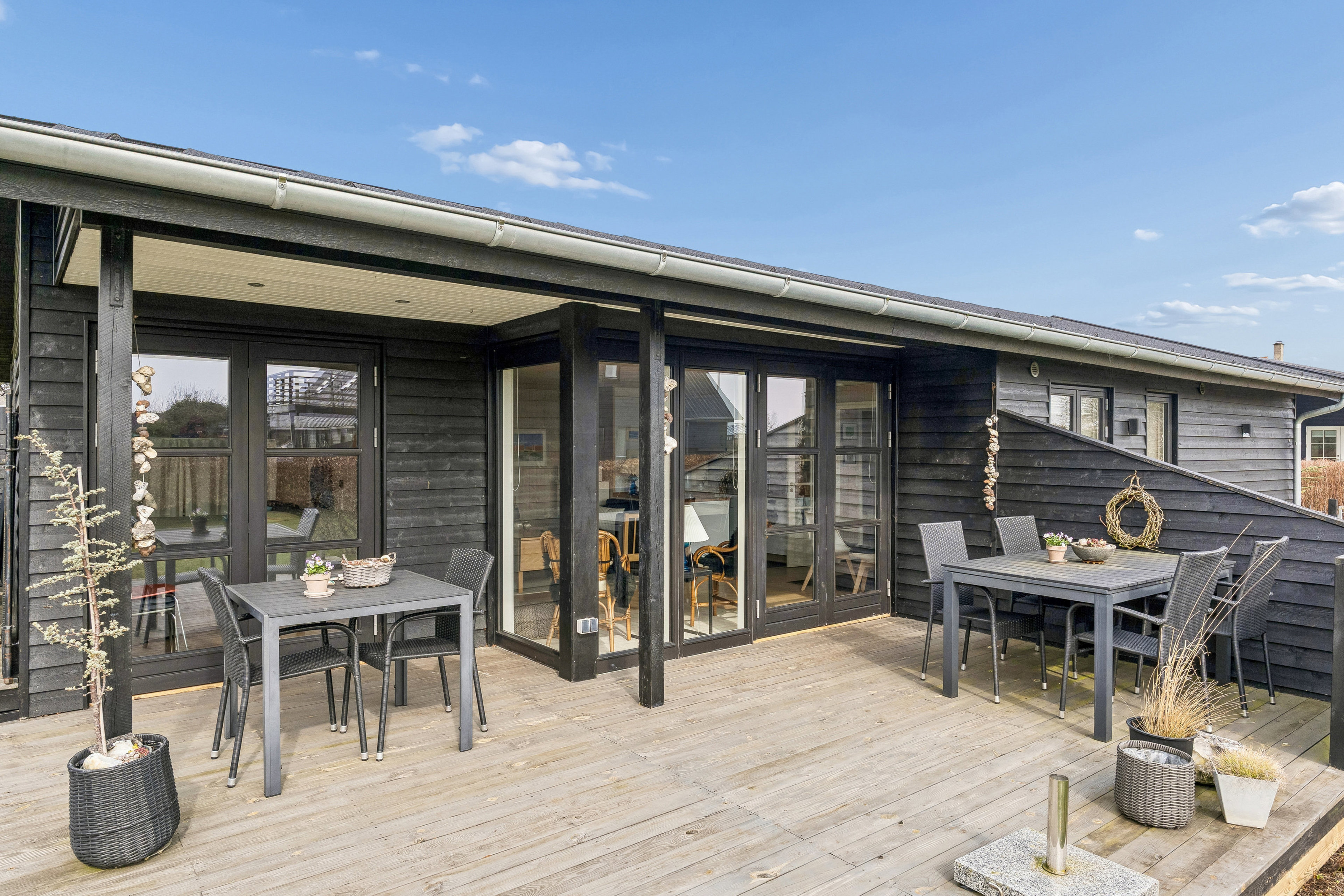 Udvendigt fremstår ejendommen med et stilrent og eksklusivt udtryk, hvor de sorte termovinduer og den store mørke træterrasse smukt omkranser boligen og skaber flere hyggelige opholdsrum under åben himmel.