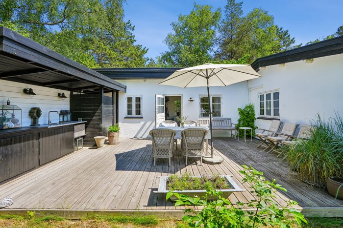 Solfyldte træterrasser både mod syd og vest med dejligt udendørskøkken samt udendørsbruser.