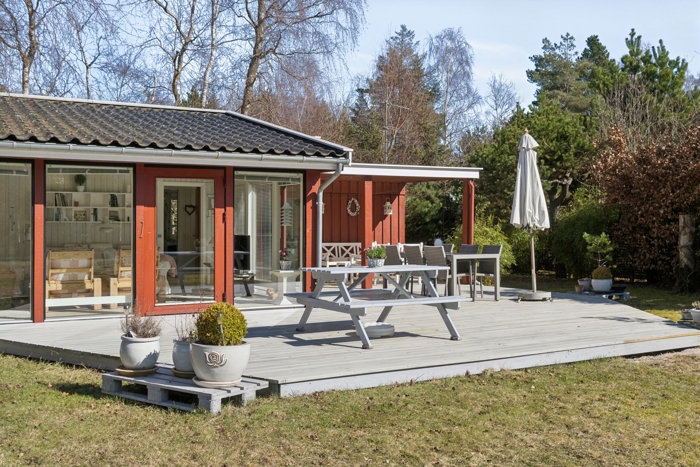 Huset får følgeskab af tre praktiske udhuse, og samtlige bygninger er nymalede i farven Svenskrød fra Gori. Indenfor kendetegnes boligen af hvide flader og lyse naturnuancer, der bidrager til den luftige atmosfære.