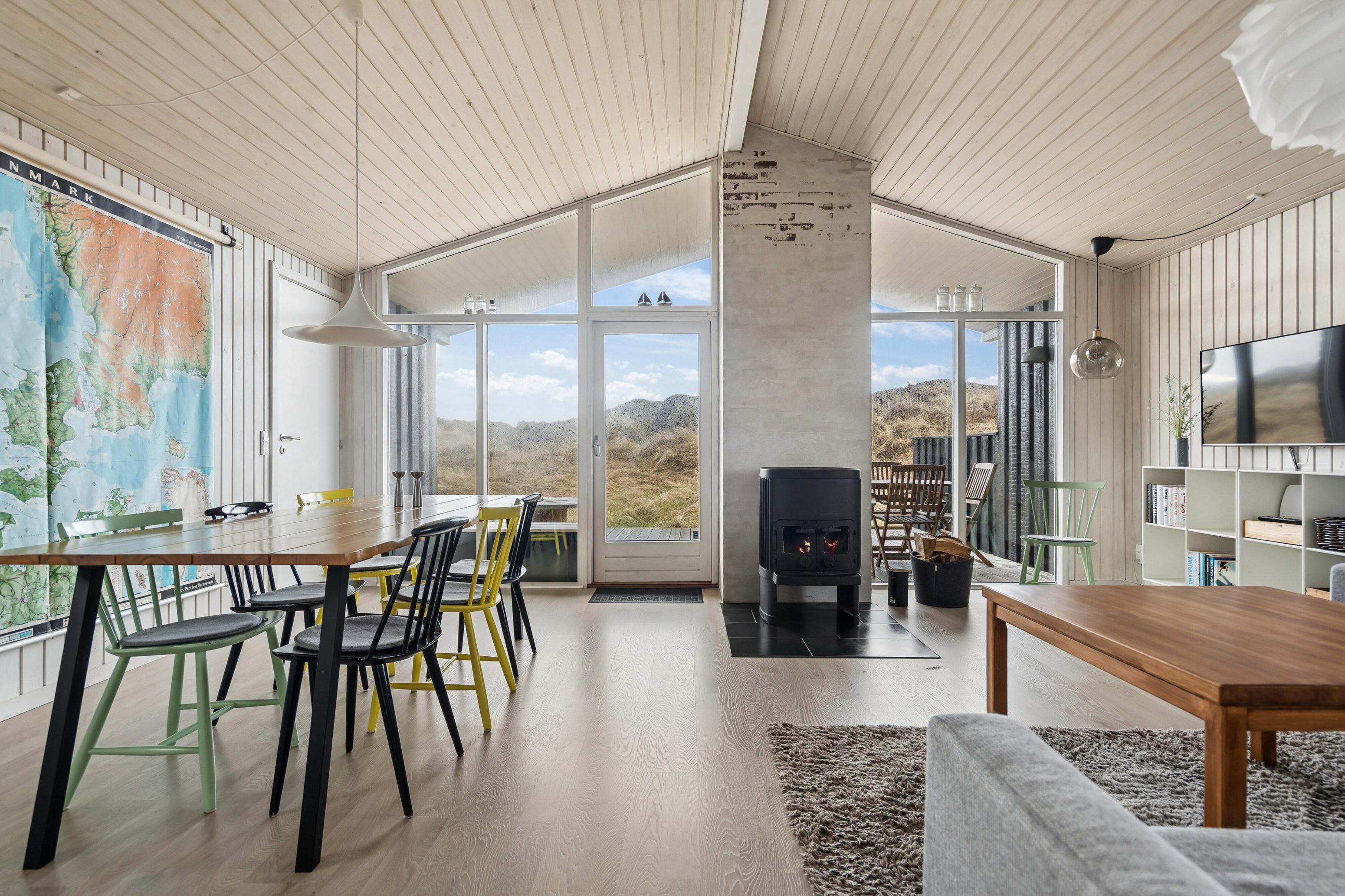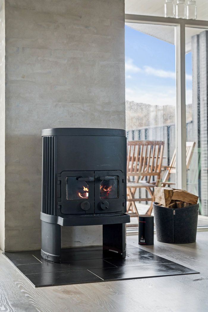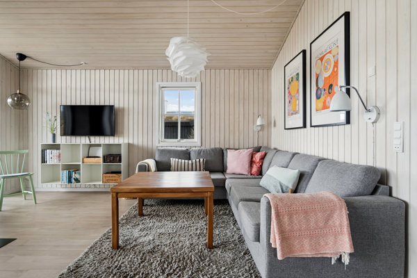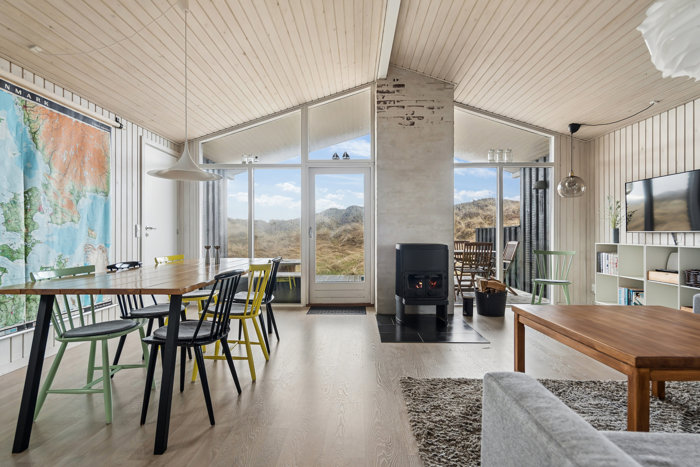 Husets hjerte er den hyggelige opholdsstue, hvor brændeovnen skaber varme og stemning på de kølige dage, mens de store vinduespartier inviterer naturen helt ind i rummet. Her er der plads til nærvær, ro og ægte sommerhusliv.