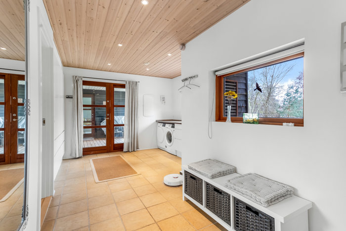 Terrassen smelter naturligt sammen med et stort, helårsisoleret udhus, der giver ekstra