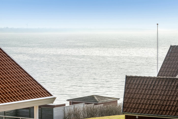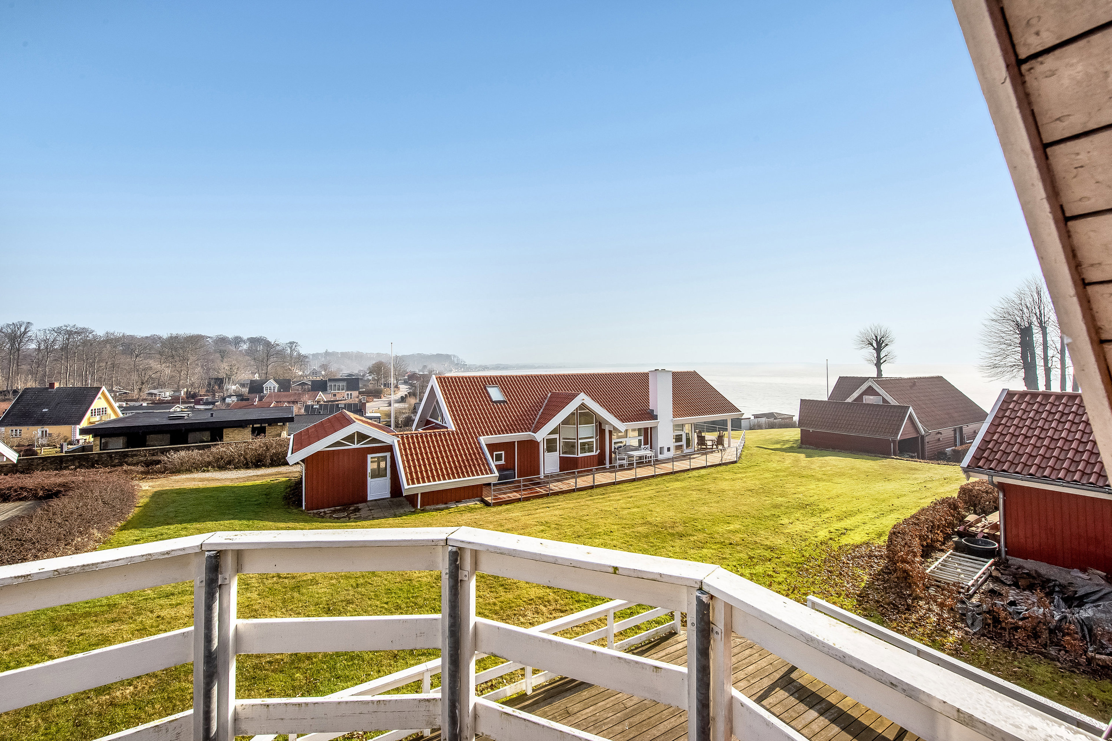 Udenfor fortsætter oplevelsen af husets attraktive beliggenhed. Den store terrasse giver rig mulighed for ophold i solen, og fra både terrasse og altan kan man nyde udsigten over vandet og det kuperede landskab omkring Kelstrup Strand.