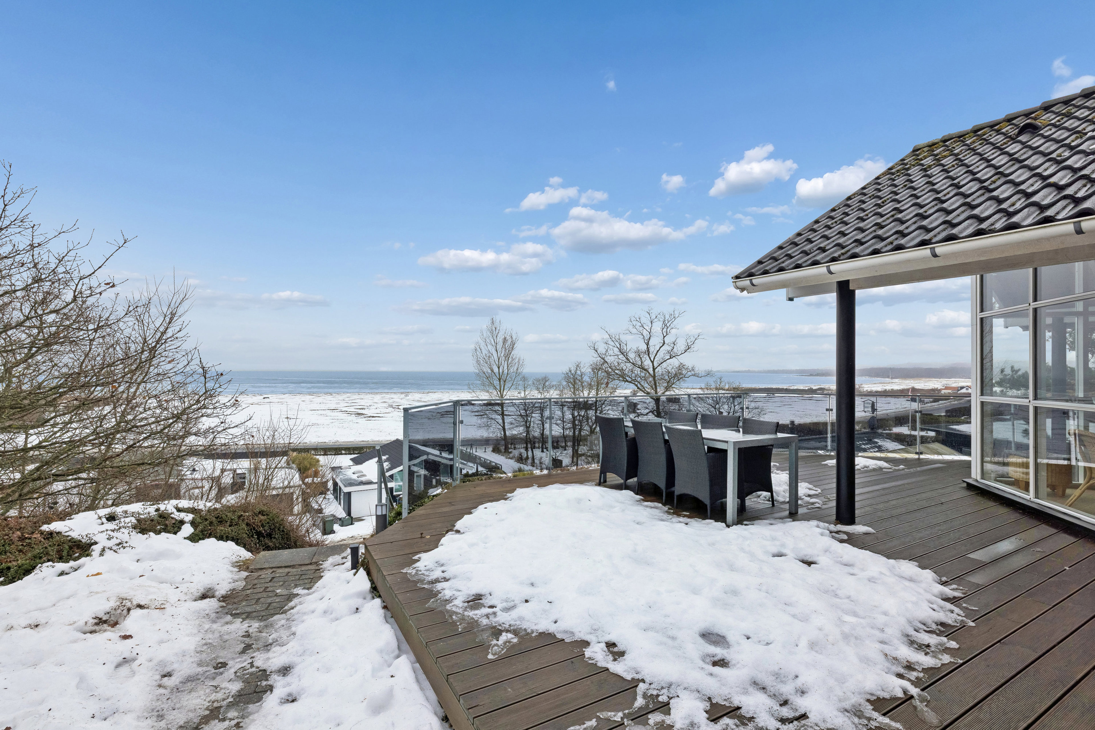 Sonnehuset blev opført i 1997 og står stadig i en tidløs stil med store vinduespartier, der inviterer lyset indenfor og samtidig indrammer den betagende udsigt over vandet. Takket være den høje beliggenhed kan I nyde en fantastisk panoramaudsigt over de blå bølger – både inde fra stuen og fra terrassen, der inviterer jer ud under åben himmel. Den sydvendte terrasse ligger nemlig i direkte forlængelse af opholdsrummet indenfor og bliver dermed et naturligt samlingspunkt hele sommeren. Her kan solen nydes fra morgen til aften, mens den øvrige grund er nem at holde og giver god plads til både udeliv såvel som praktisk opbevaring i det tilhørende skur.