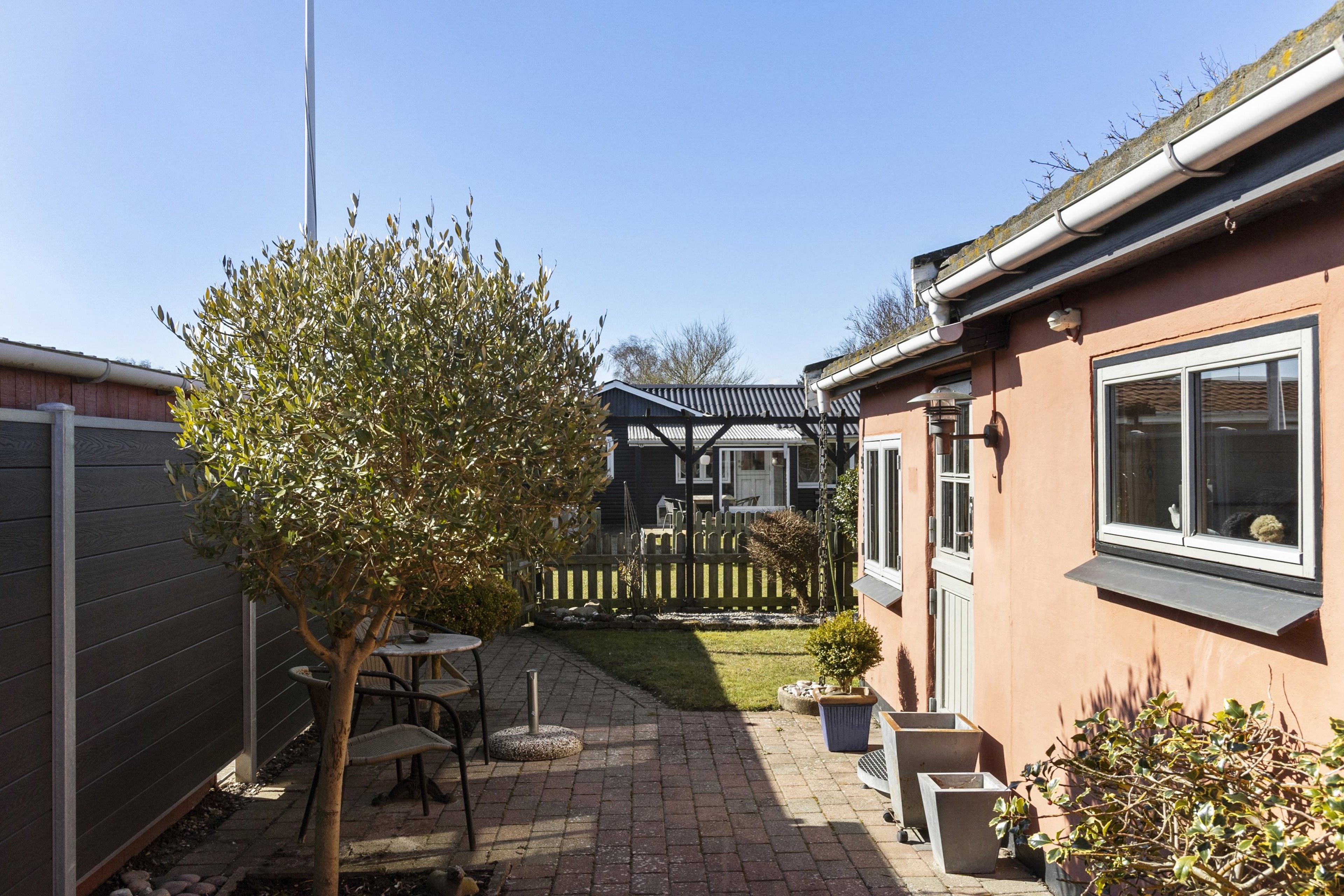 Uden for huset er der et fint lille græsareal, 3 rigtig gode terrasser, hvor der er rig mulighed for at fange solen samtidig er der godt redskabsrum.