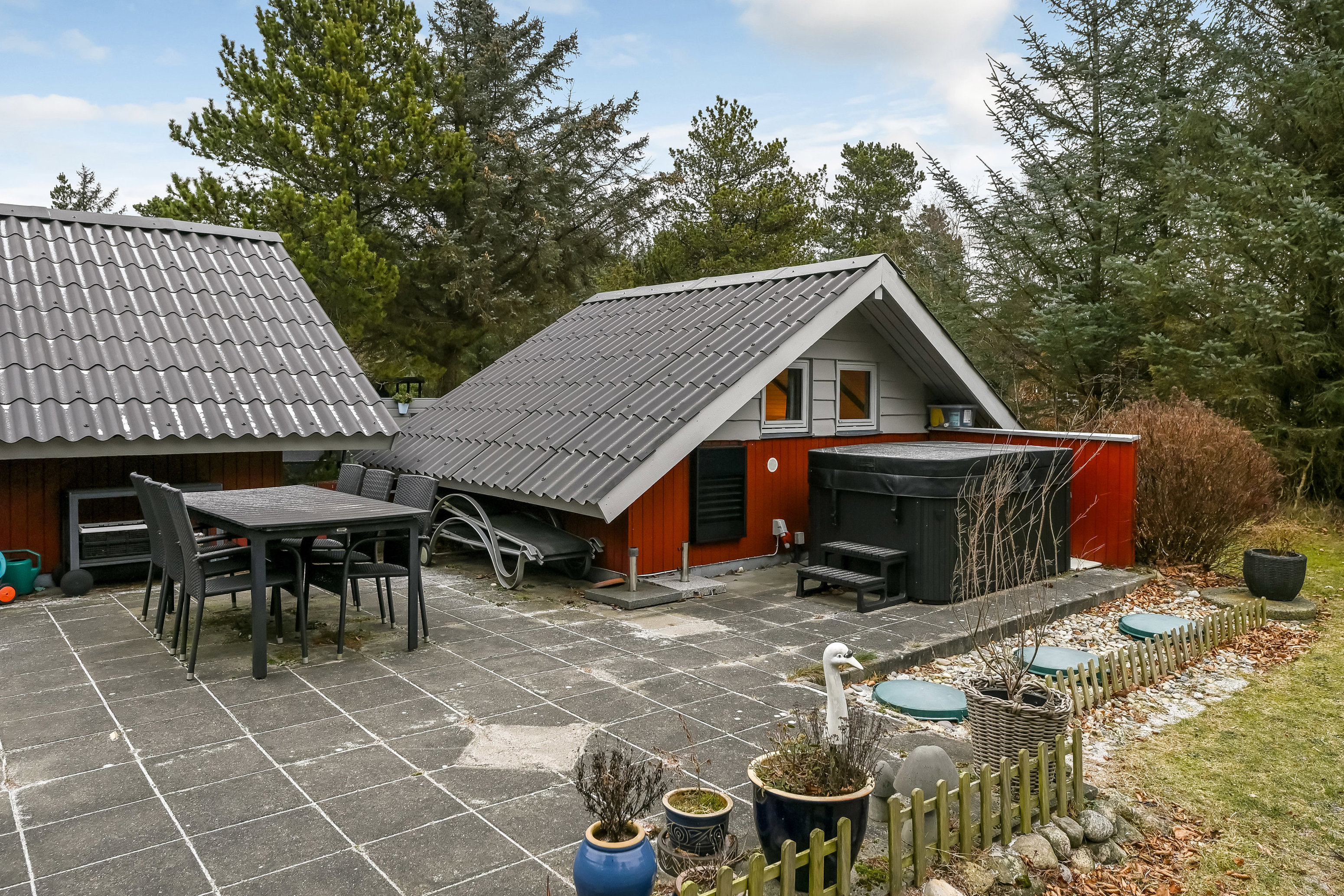 Udendørs forkæles man med et lækkert spabad under åben himmel, hvor afslapning kan nydes året rundt uanset årstid. Ejendommen rummer desuden et hyggeligt anneks, som er oplagt til overnattende gæster, hobbyrum eller ekstra opholdsplads. En stemningsfuld pavillon danner rammen om mange gode stunder, så snart solen og varmen melder sig. Den store og ugenerede naturgrund på hele 2.738 m² byder blandt andet på flere frugttræer og sikrer både privatliv, ro og masser af plads til udeliv, leg og afslapning.