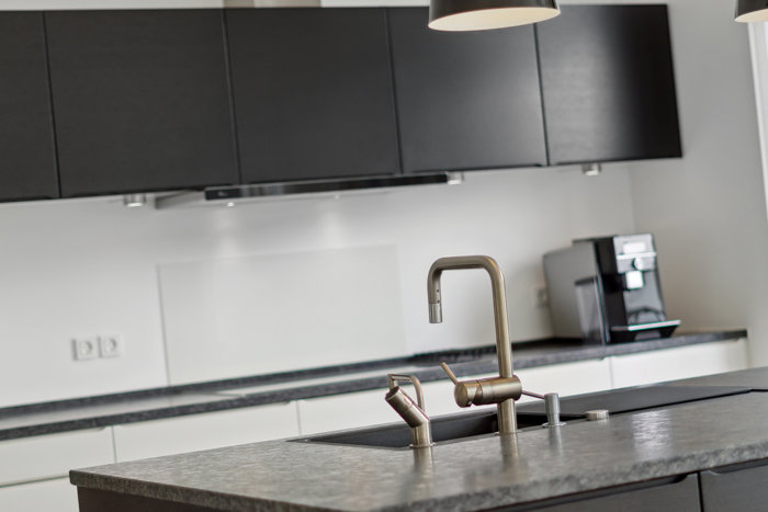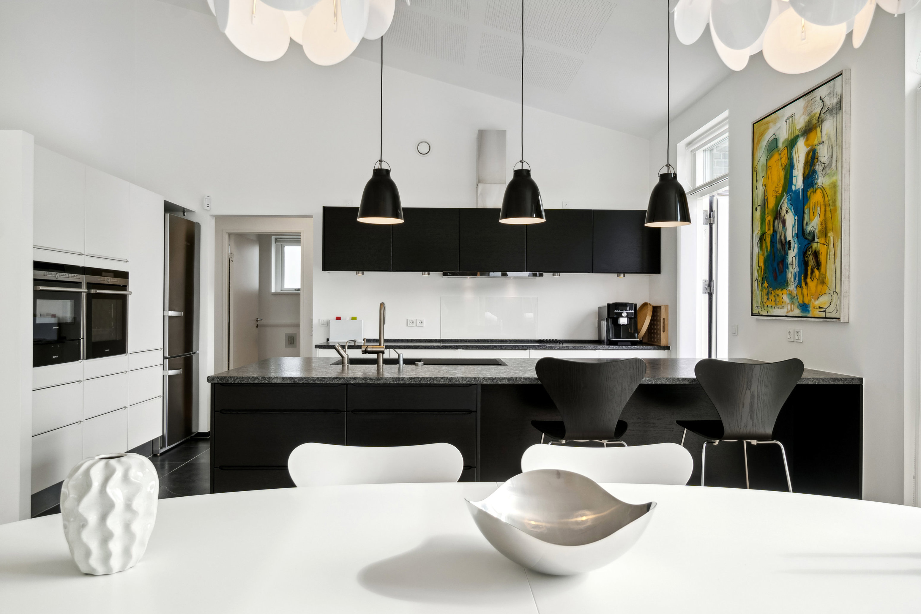 Boligens hjerte er det lyse køkken-alrum fra HTH, som er i åben forbindelse med opholdsrummet. Her er der over fire meter til kip, og akustikken er optimeret med perforerede overflader. De imponerende vinduespartier fra gulv til loft trækker dagslyset ind og skaber en smuk forbindelse mellem inde- og udeliv. Fra køkken-alrummet er der udgang til den sydvendte stenterrasse via hele fire steder, så man altid kan finde en solrig krog at opholde sig i.