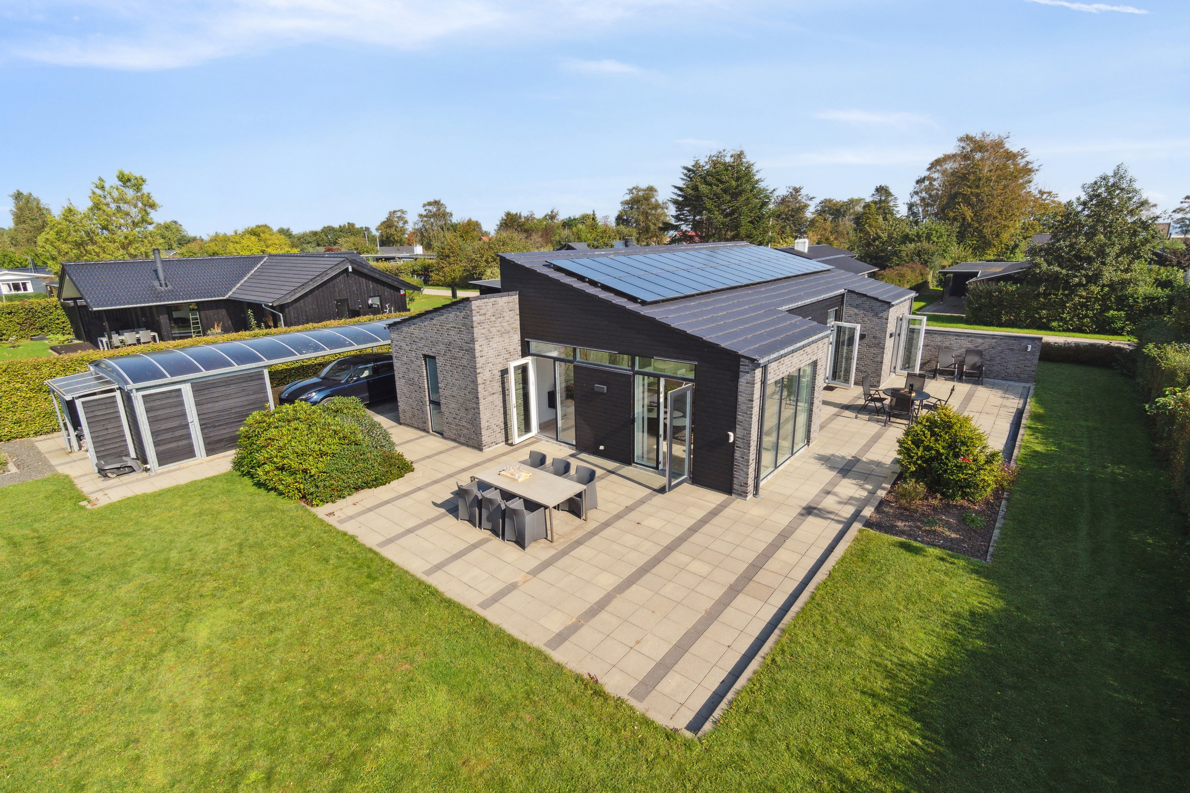 Udefra præsenterer boligen sig med grå murstensfacader i varierende nuancer, der smukt spiller sammen med det sorte træværk og giver huset et tidløst og eksklusivt udtryk. Indvendigt er der lagt vægt på funktionalitet og æstetik med bl.a. naturskiffer og brede egetræsplanker.