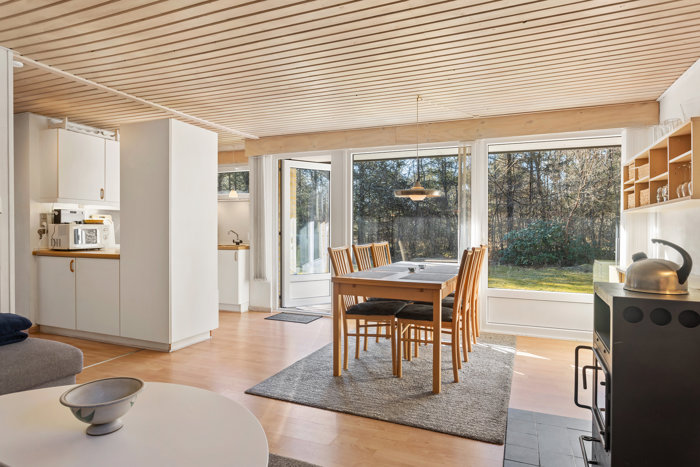 Indenfor byder huset på en lys og indbydende opholdsstue, hvor dagslyset får lov at spille flot sammen med de rolige rammer. Det integrerede hvide køkken ligger i åben forbindelse med opholdsrummet, så huset får et naturligt samlingspunkt, hvor man let kan nyde hyggelige stunder med familie og venner. Her er en rar og uformel atmosfære, som passer perfekt til livet i fritidshus, og fra opholdsrummet er der direkte udgang til en dejlig træterrasse, der inviterer til lange sommerdage, afslappede morgenkaffer og lune aftener under åben himmel.