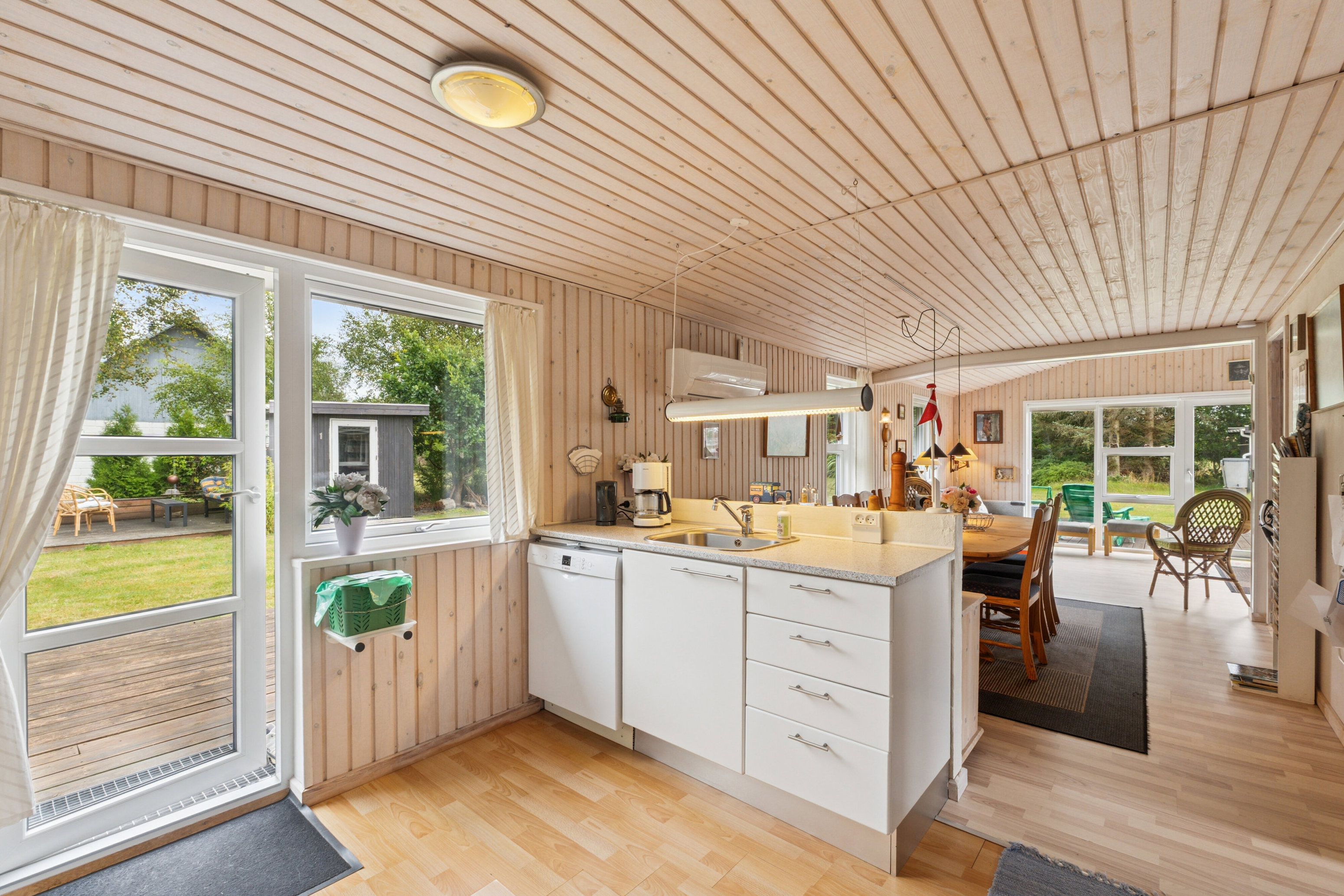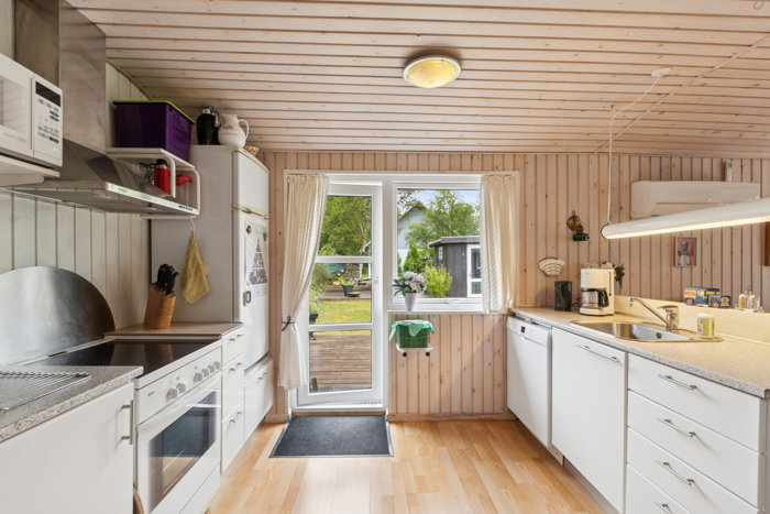 Husets hjerte er det åbne køkken-alrum, som ligger i åben forbindelse med stuen. Køkkenet er funktionelt og har en stor spiseplads, hvor man nemt kan samles til hyggelige måltider. Den åbne planløsning gør boligen særdeles indbydende, og i stuen strømmer lyset ind fra fra de store vinduespartier og skaber en behagelig og varm atmosfære. Herfra er der direkte udgang til terrasse og haven, hvor man kan nyde sommerdage på terrassen eller under åben himmel.