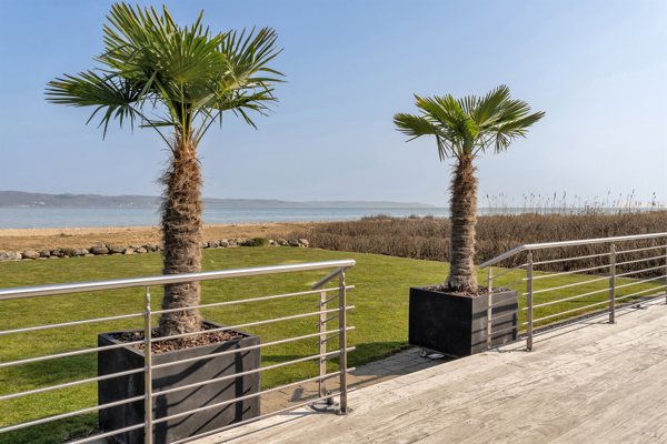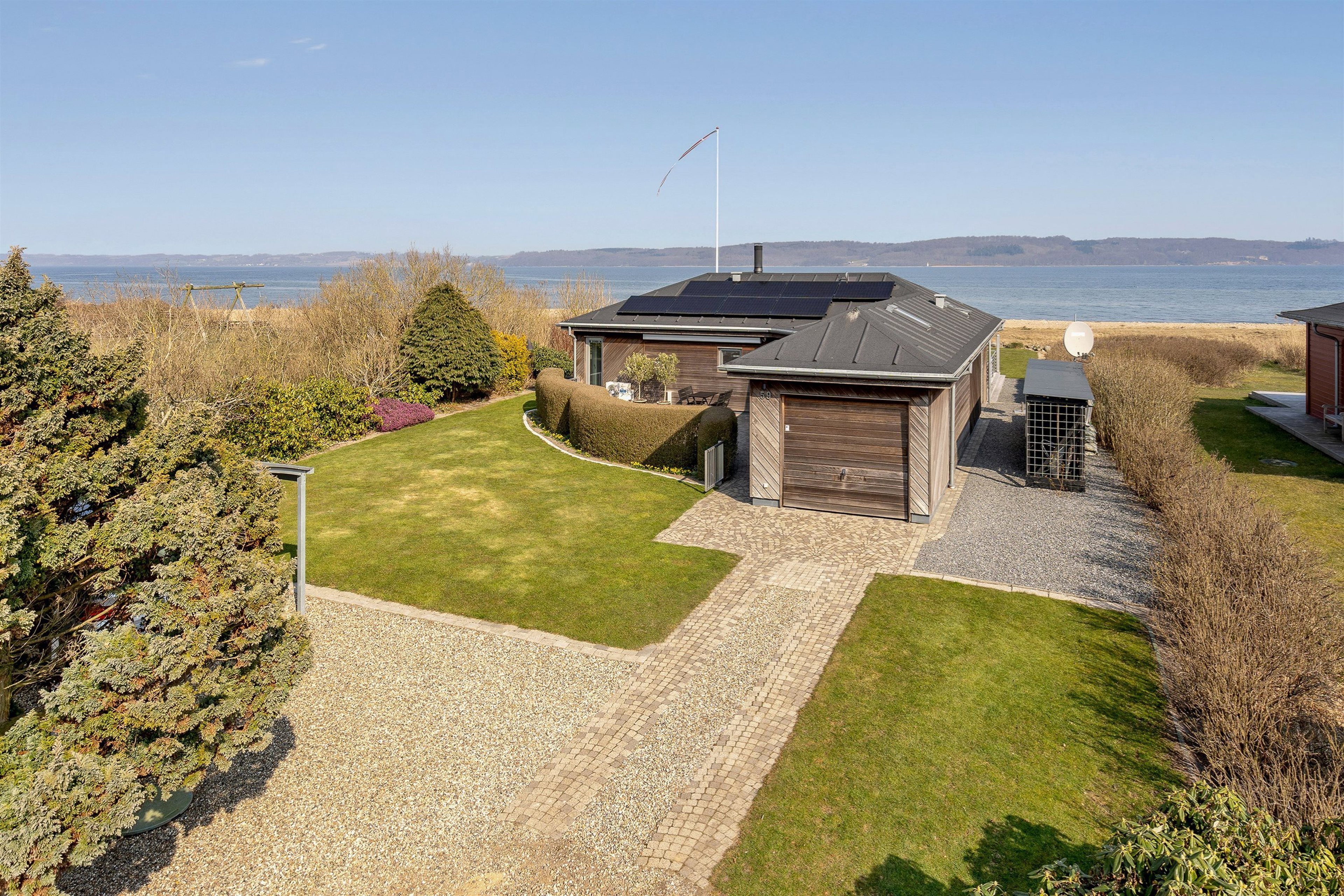 Indenfor finder du et stort, åbent køkken, der er i perfekt forbindelse med en lys og indbydende stue. De kæmpe vinduespartier i stuen sikrer en spektakulær udsigt over vandet og giver et fantastisk naturligt lys, der fylder hele rummet. Køkkenet er moderne og rummeligt, ideelt til både dagligdags madlavning og større middage, som kan nydes med en uforglemmelig udsigt.