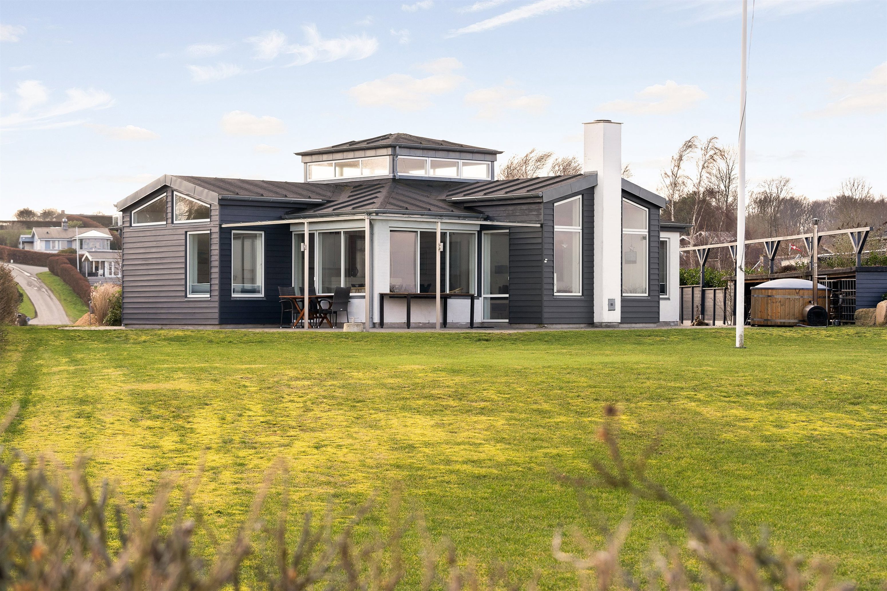 Dette skønne sommerhus som er tegnet af arkitekten Brian Mortensen, rummer hele 136 m² og ligger på en stor, indbydende grund med direkte adgang til stranden og en fantastisk fjordudsigt.