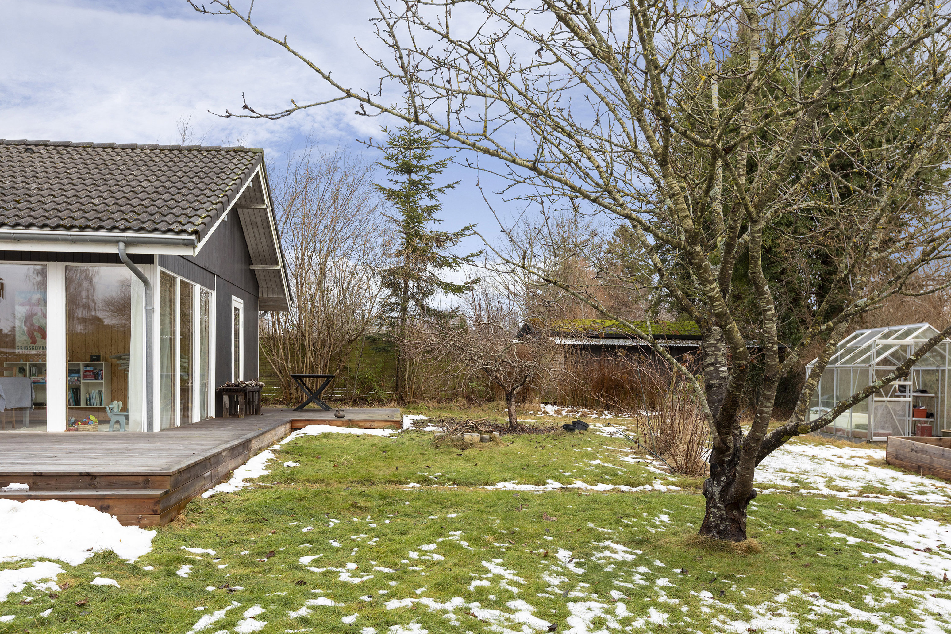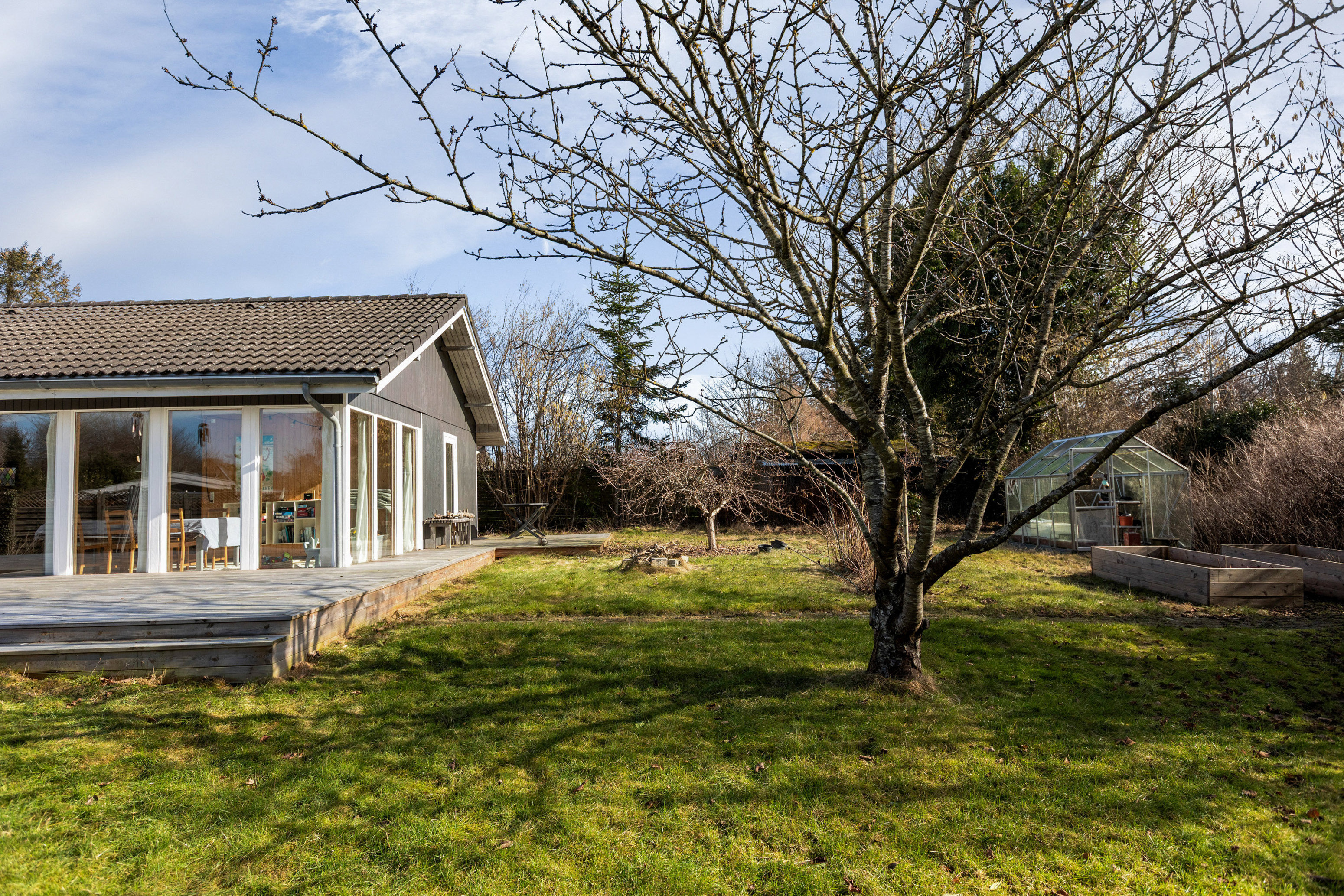 Grunden er solfyldt og smukt anlagt med frodig beplantning, drivhus og en stor træterrasse, der smyger sig om huset på to sider. Her kan dagens måltider nydes i solen, mens aftenerne forlænges i læ og grønne omgivelser. Stemningen er afslappet, varm og fuld af god energi.