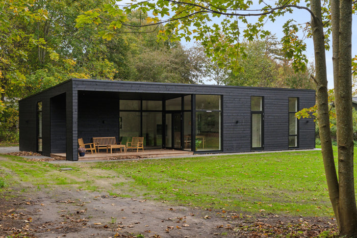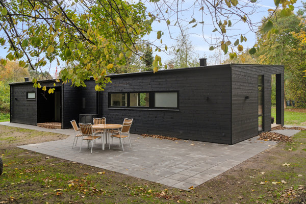 Den overdækkede terrasse er elegant integreret i sommerhusets arkitektur, der kendetegnes af rene linjer. Den sortmalede træfacade får følgeskab af matchende sorte vinduesrammer og et sort, fladt tag med let hældning.