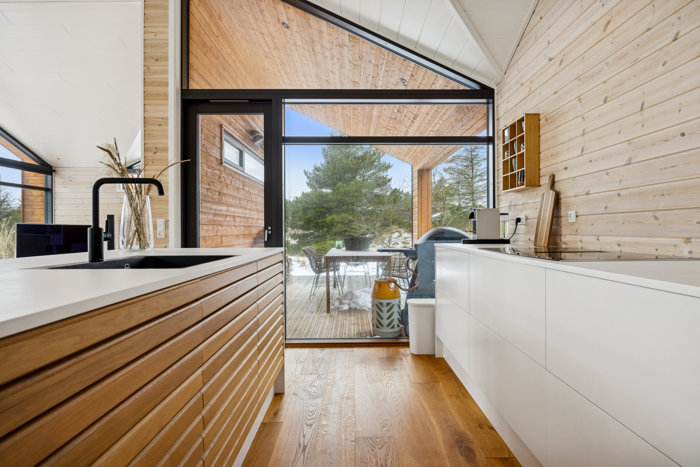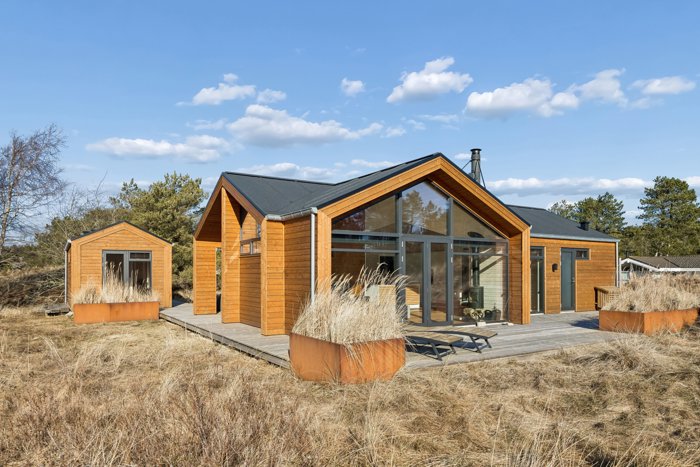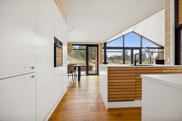 Husets flotte og markante træfacader og store vinduespartier smelter harmonisk sammen med de naturskønne omgivelser, så man får et stilrent, nordisk udtryk, der passer perfekt til området!