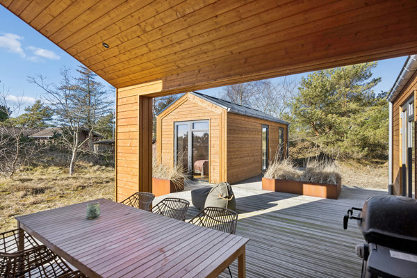 Rundt om huset er privatlivet i højsædet - her er altid mulighed for at finde en krog med sol, skygge eller læ på den store træterrasse. Til de varme sommerdage, har man tilmed mulighed for at hoppe under udebruseren!