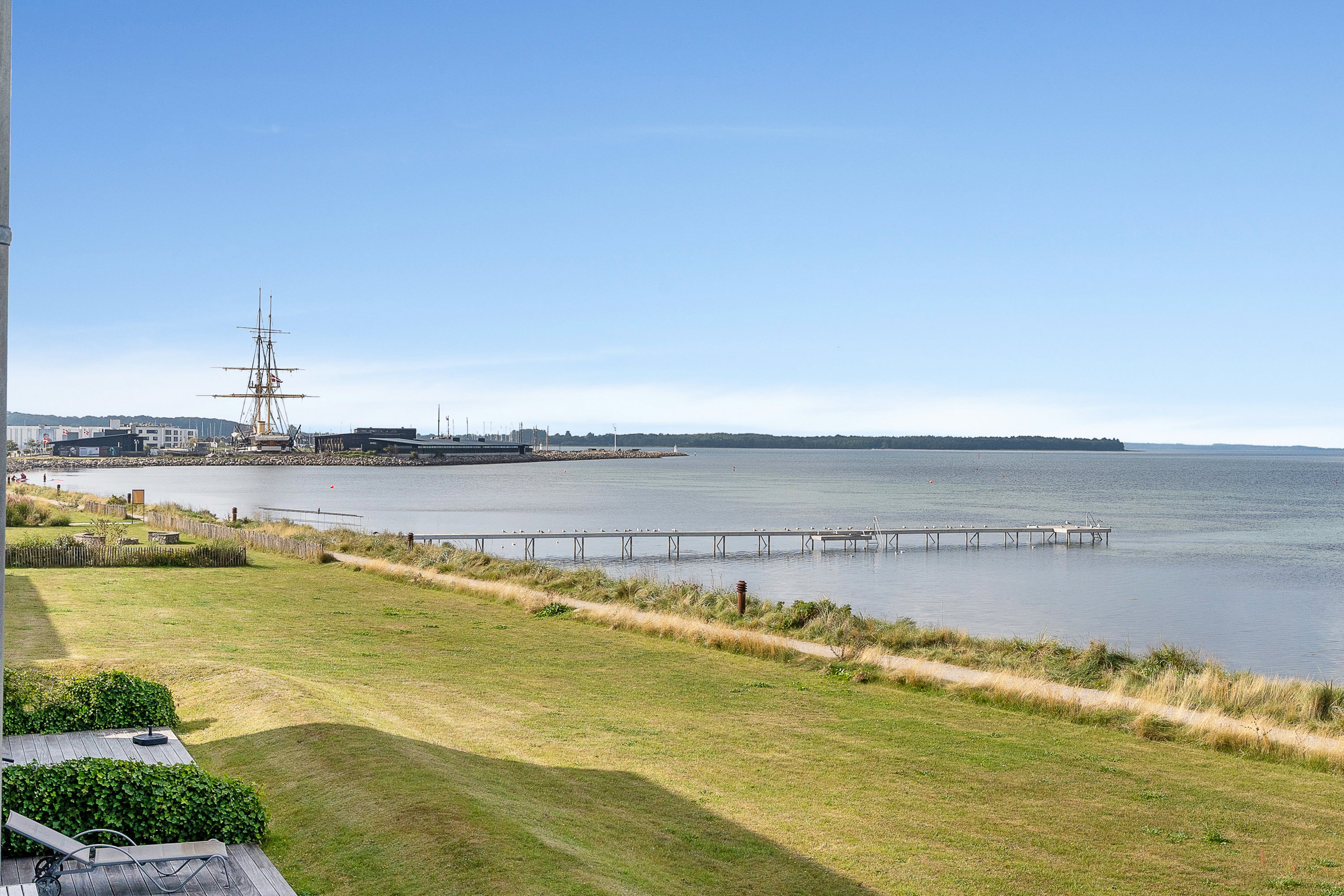 Udsigten er ikke det eneste, der gør beliggenheden særlig, for ferielejlighederne ligger helt centralt i Ebeltoft. Byen har vind i sejlene både som helårsbase og feriedestination, og de stemningsfulde, brostensbelagte gader lokker med spisesteder og kunsthåndværk i uhørt overkommelig gåafstand fra adressen. I kan se til Fregatten Jylland, og Føtex ligger lige ovre på den anden side af Nrd. Strandvej.