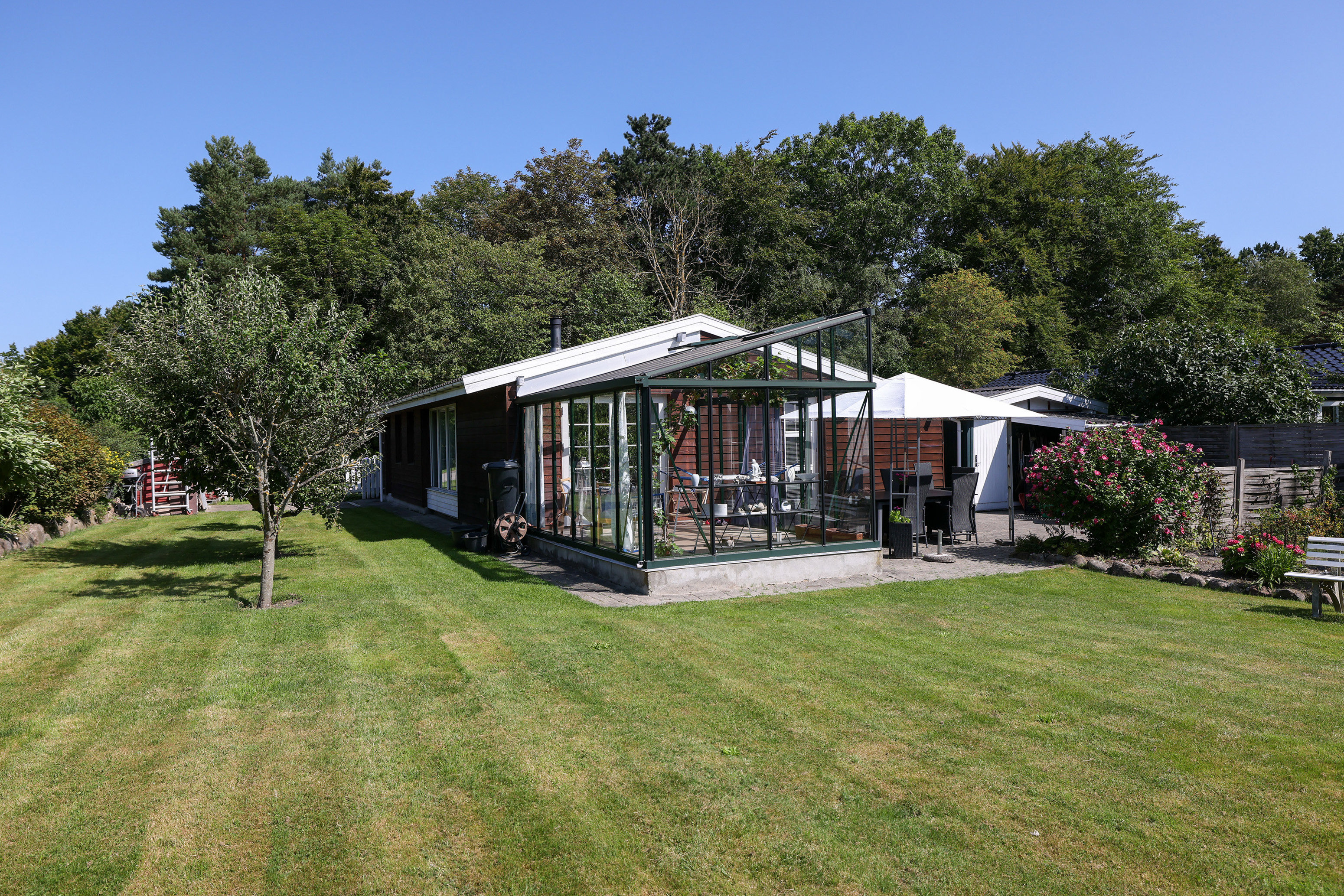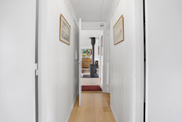 Opholdsrummet, som kombinerer stue og køkken i ét, er husets naturlige samlingspunkt. Køkkenet er enkelt og praktisk med rigelig skabsplads, og det åbner sig mod spiseområdet, så samtalerne kan fortsætte, mens maden tilberedes. Stuen er rummelig med plads til både spisebord og en hyggelig sofaafdeling. Lyset strømmer ind fra store vinduespartier, og dørene mod udestuen trækker naturen helt ind i rummet. Udestuen er et kapitel for sig. Med glas hele vejen rundt er det et lyst frirum, der forlænger sommeren og giver mulighed for at nyde haven, selv når vejret ikke helt samarbejder. Her kan du sidde med morgenkaffen, mens solen står op, eller samle familien til en hyggelig middag i aftensolen med udsigt til den grønne beplantning, der omkranser grunden.