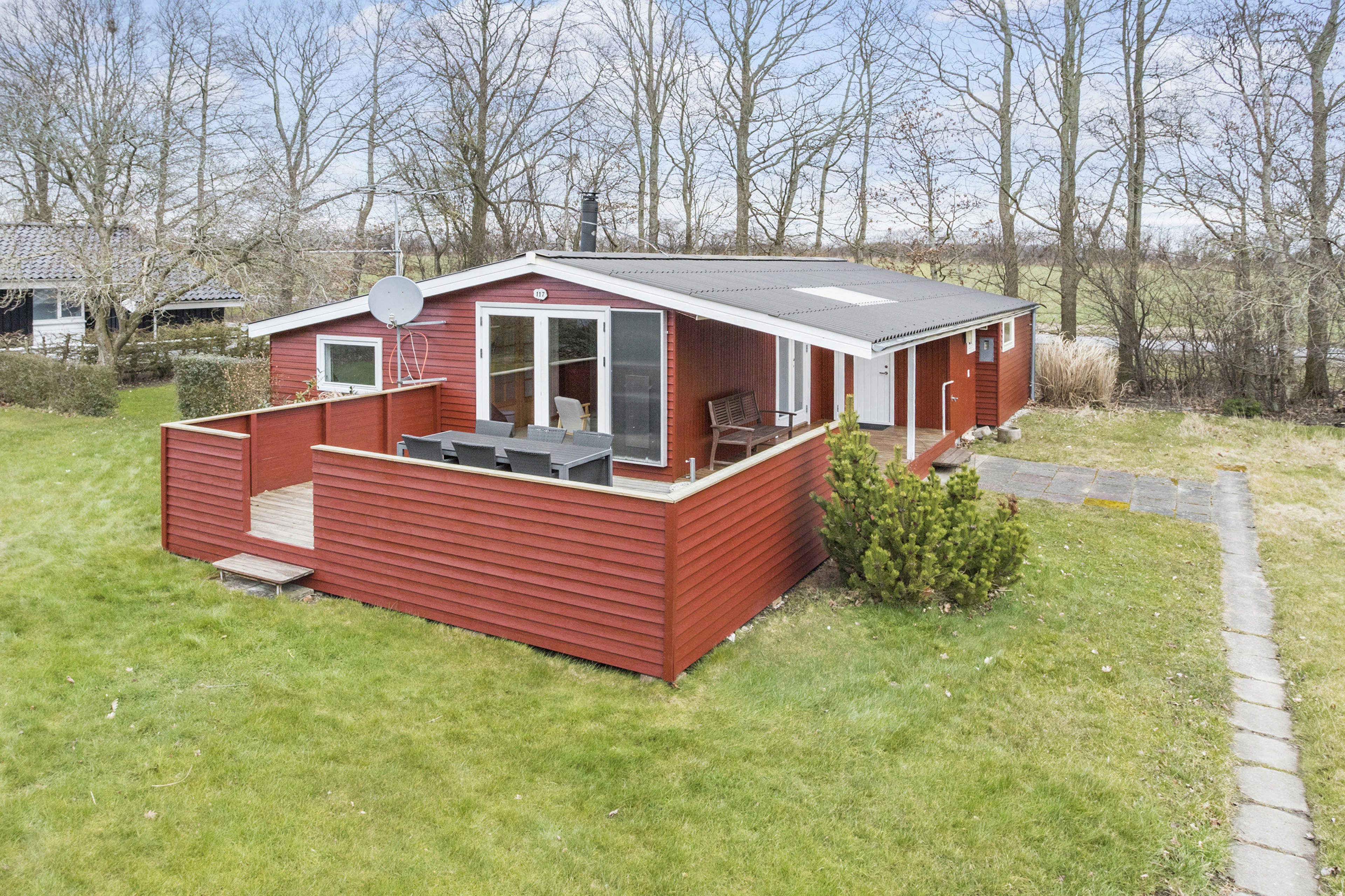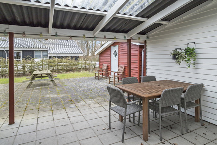 Udenfor finder man flere dejlige terrassemiljøer, herunder en stor overdækket terrasse mod vest, som forlænger udesæsonen og giver mulighed for at nyde udelivet i al slags vejr. Haven er anlagt med fokus på let vedligeholdelse og indrammes af grønne omgivelser, som giver både ro og privatliv.