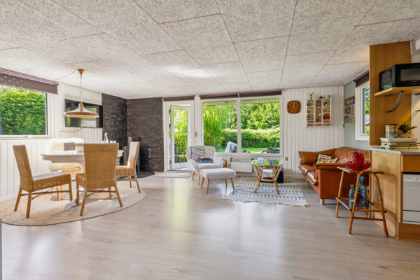 Boligens hjerte er det store og åbne opholdsrum med åbent køkken, luft/luft varmepumpe (2019) for økonomisk opvarmning samt en nyere brændeovn til de hyggelige aftener. Her er plads til den store familie-sammenkomst, men også inddelt, så det virker hyggeligt og rart. Der er udgang til den delvis overdækkede sydvendte terrasse.