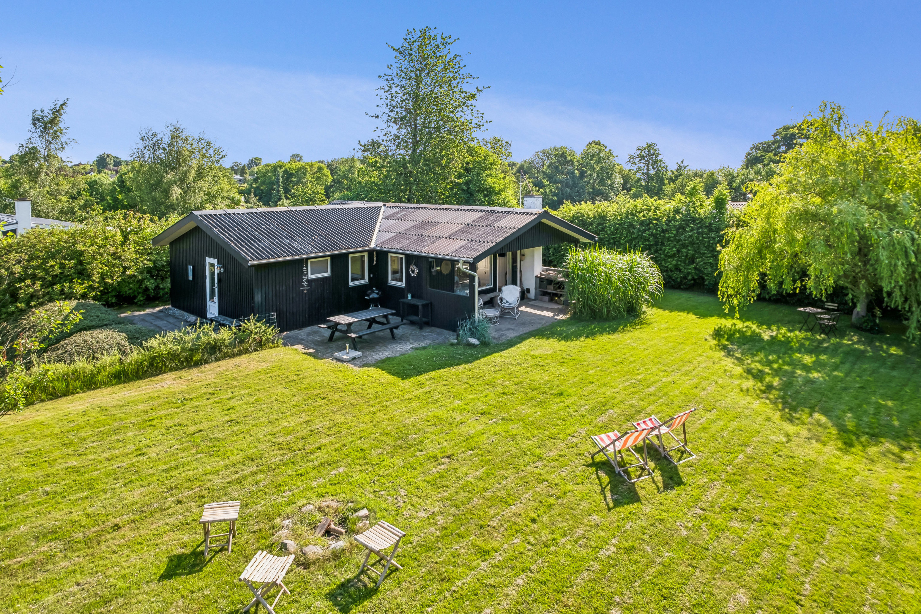 Når man ankommer til ejendommen, er man ikke i tvivl om, hvor tæt på den smukke natur man er kommet, uden at være langt væk fra alting. Grunden er højtbeliggende, og fra de sydvest vendte terrassemiljøer, er der en skøn udsigt mod trækronerne i skoven, og solen kan nydes hele dagen lang. Haven er nem at holde, indhegnet og der er god plads til børnenes leg.