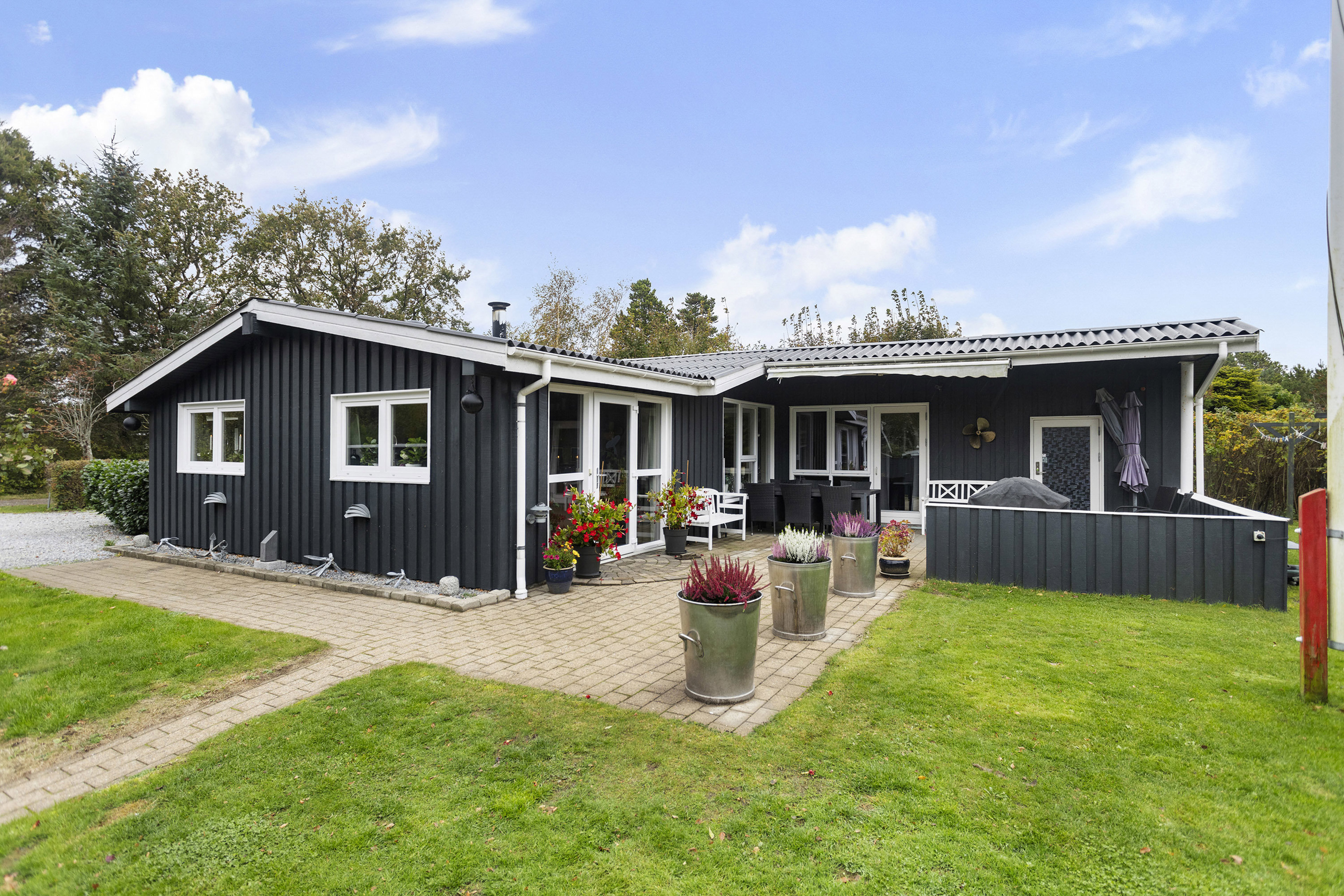 Allerede ved ankomsten mærker man roen og stemningen. Den store grusbelagte indkørsel giver god plads til parkering, og de flotte flisebelægninger leder naturligt videre til terrassen og husets indgang. Indenfor venter et hjem, der indbyder til afslapning og samvær – uanset om man er her hele sommeren eller blot for en weekend.