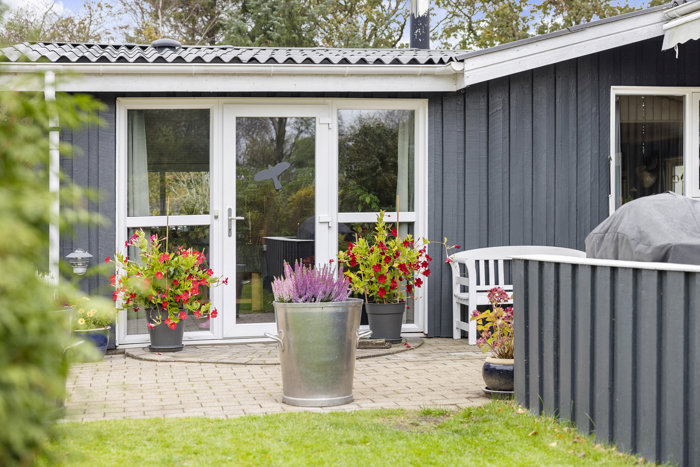 Udenfor fortsætter den gode stemning. Grunden er både hyggelig og velanlagt, med fine kroge og terrasser, hvor man kan finde læ, nyde solen og høre havets brusen i baggrunden. Et sødt lille udhus på 11 m² fuldender helheden.
