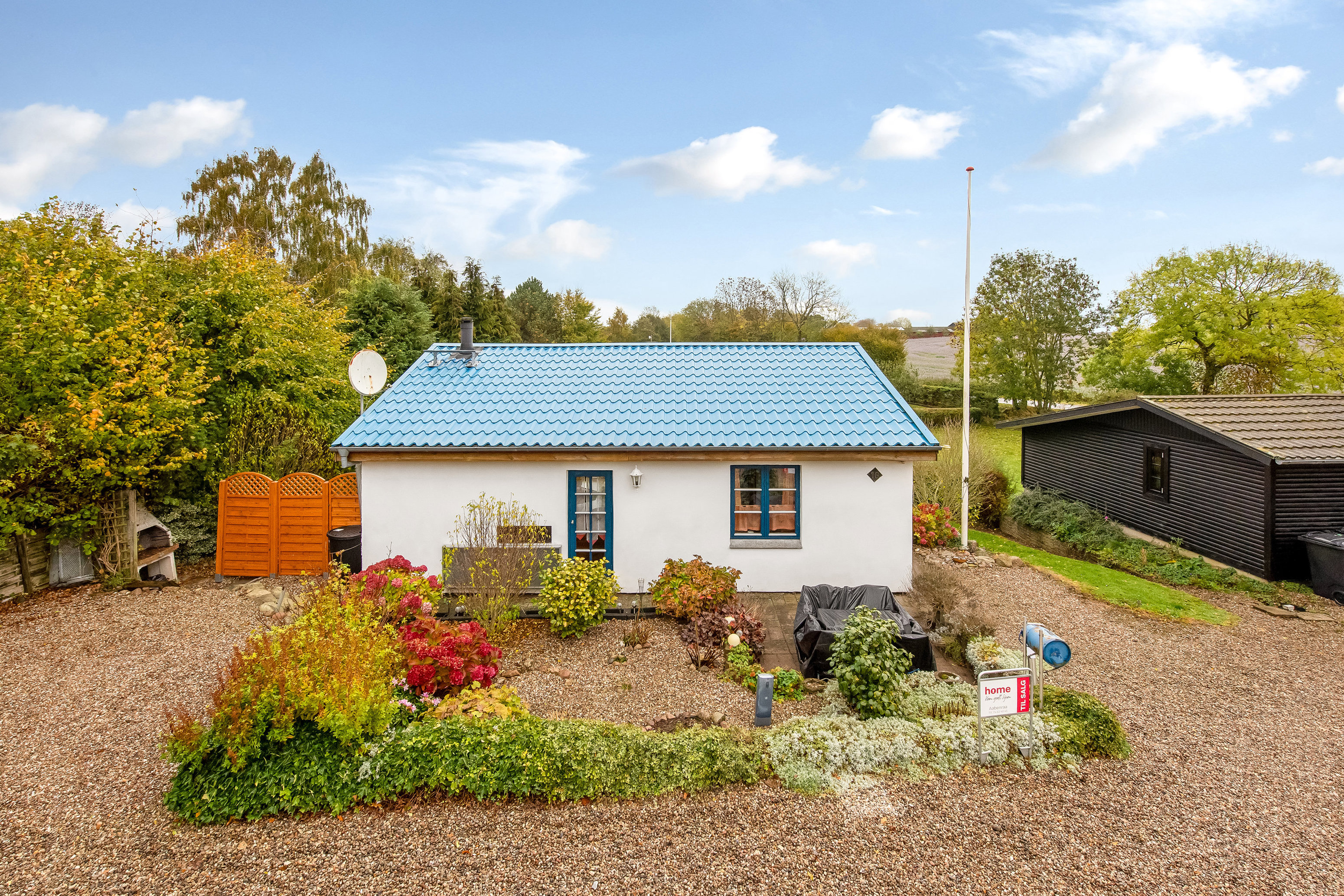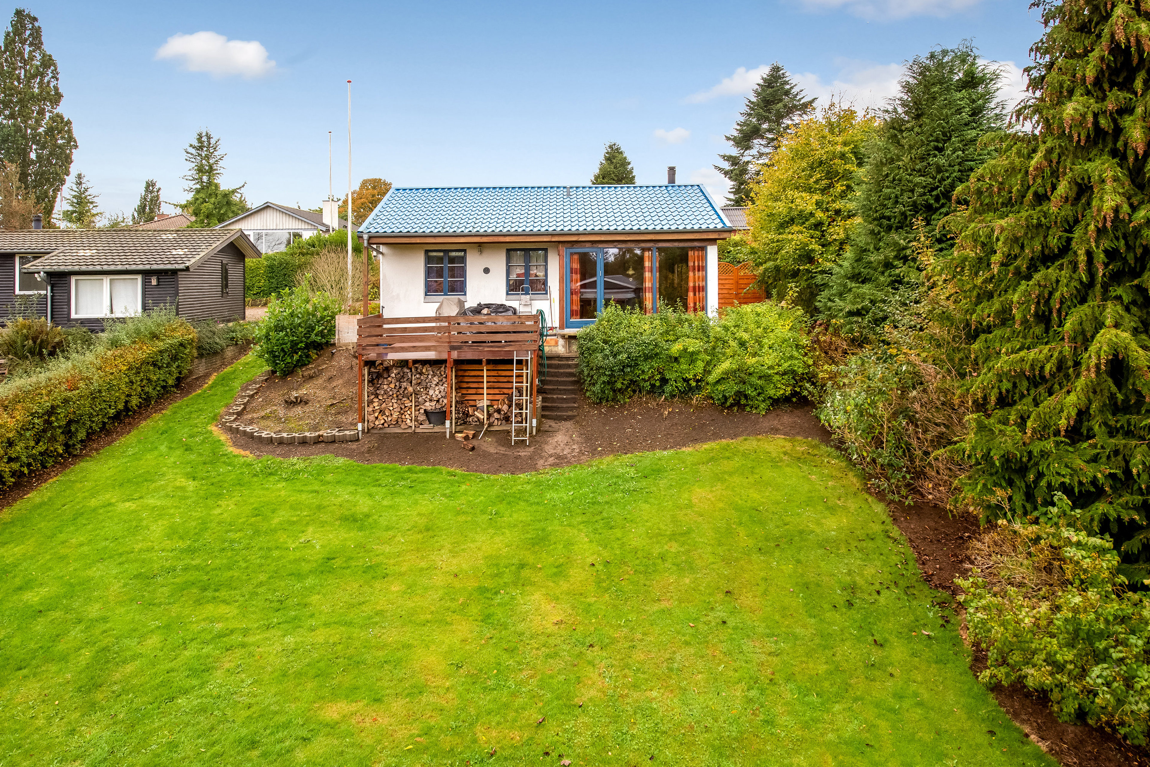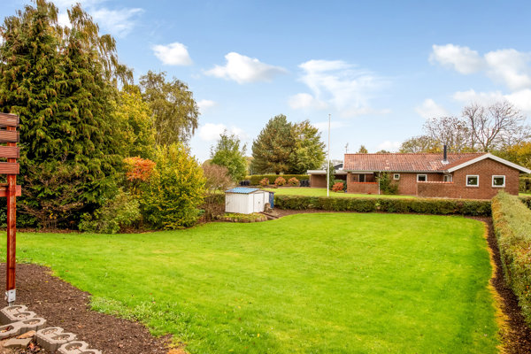 Udendørs venter en overkommelig have med en stor plæne og en hævet terrasse med plads til brændestablen nedenunder. Desuden byder grunden på endnu en terrasse foran boligen samt en flagstang og fine bede.