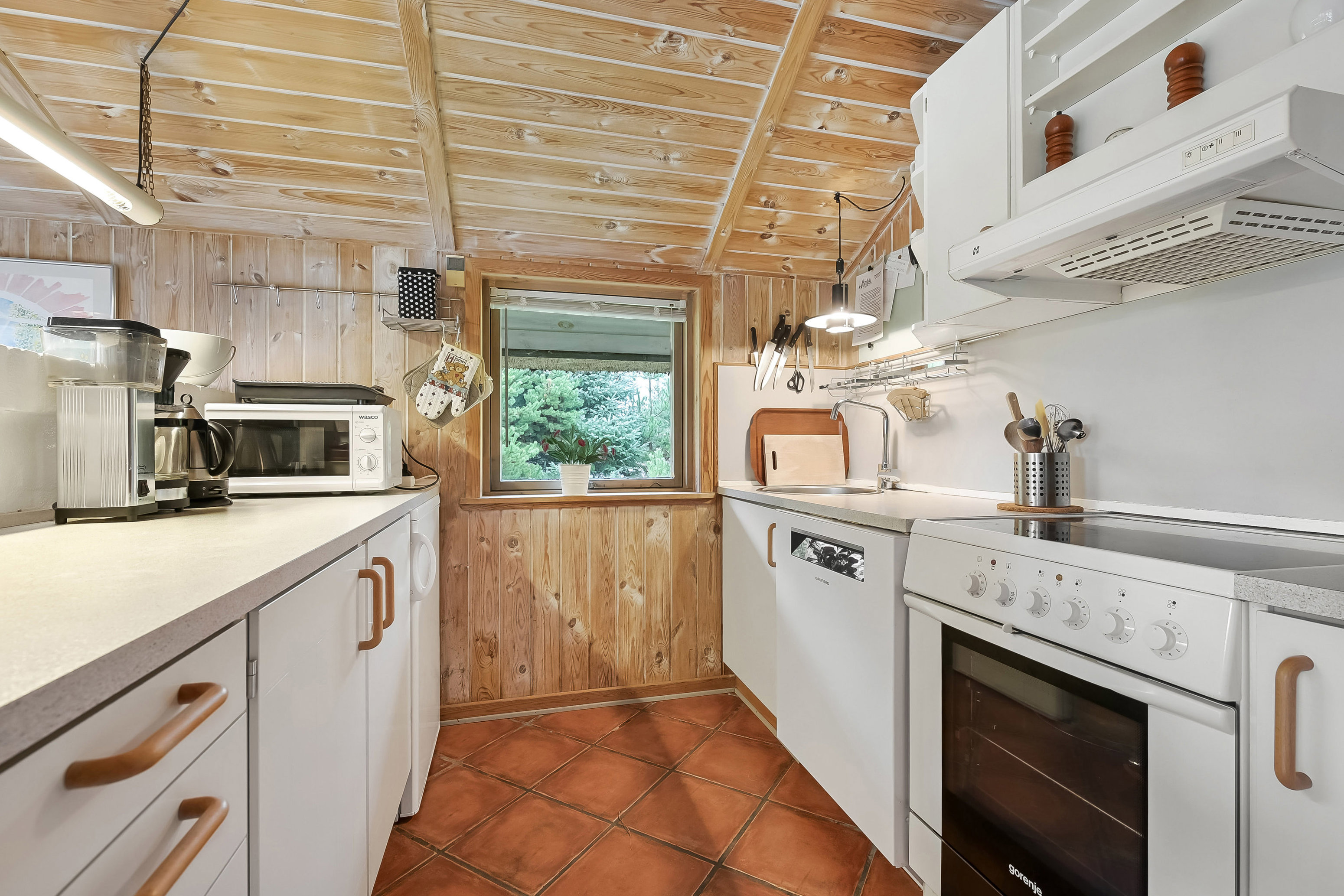 Åben køkken-alrum med Grundig opvaskemaskine, HTH emhætte, Gorenje elkomfur og Electrolux køleskab, - udgang til terrasse og opgang til: