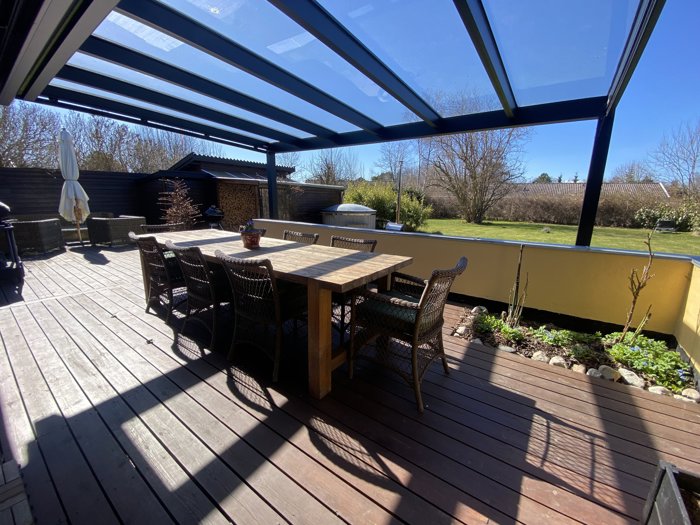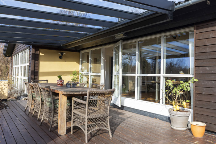 De to store leverum udgør husets naturlige samlingspunkt. Stuen og køkken-alrummet ligger i delvis åben forbindelse og giver en skøn rumfornemmelse, hvor familie og venner kan samles omkring madlavning, lange middage og afslappede aftener. Herfra er der direkte udgang til den solfyldte terrasse, som delvist er overdækket af en elegant glaskonstruktion med indbygget elektrisk markise – et sted hvor udelivet kan nydes fra de første forårsdage til langt ind i efteråret.