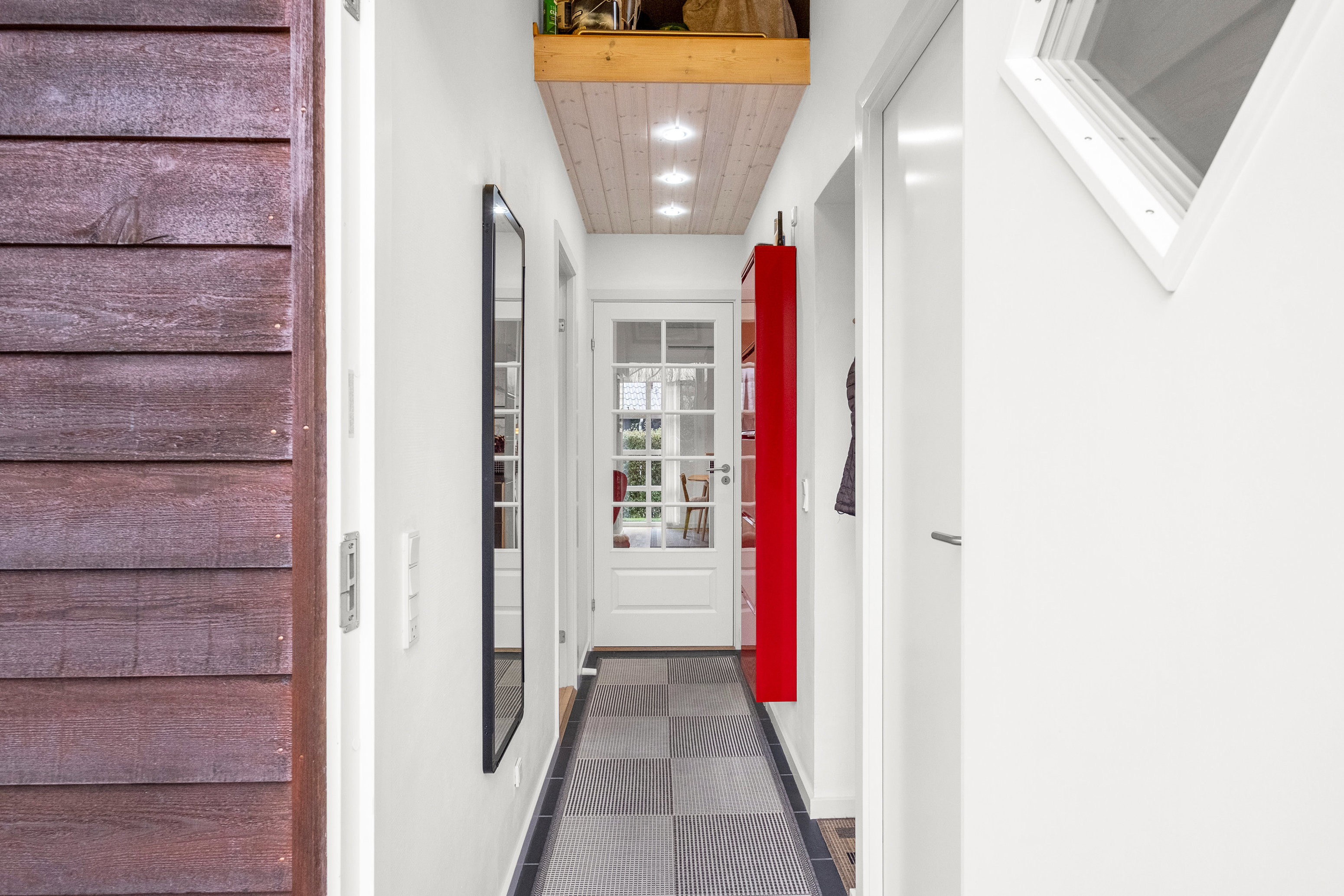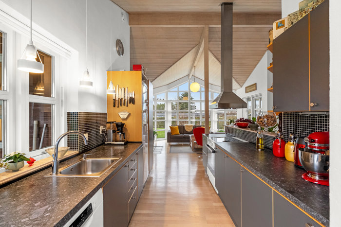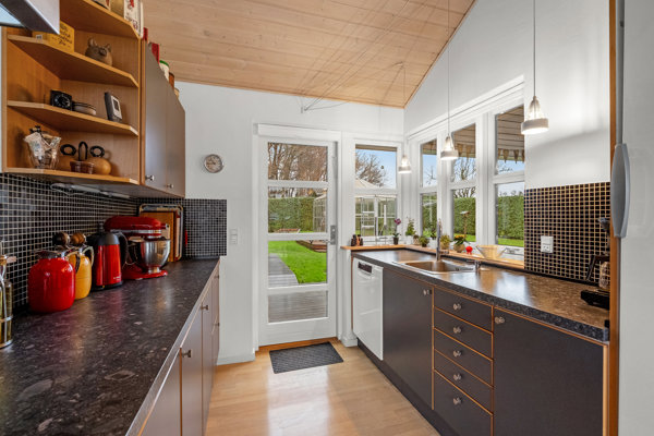 Indenfor mødes I af entré og badeværelse med gulvvarme, to værelser og en praktisk hems. I hjertet af huset finder vi et skønt, åbent køkken-alrum fra Tvis, her er loft til kip og store vinduespartier, som trækker lyset helt ind og inviterer naturen med året rundt. Den danskproducerede pillebrændeovn fra EcoTech og varmepumpen skaber tilsammen en behagelig atmosfære året rundt – også hvis man bruger huset uden for sommermånederne. Her er også viktualierum, der giver god opbevaringsplads og muligheder.