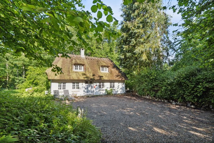 På en solfyldt plet midt i Faldeskov på strækningen mellem Nyborg og Svendborg finder I et yderst velholdt sommerhus, der emmer af den helt rette idyl. Boligen er stråtækt og har sprossede vinduer, og indenfor er der god plads til samvær og hygge.