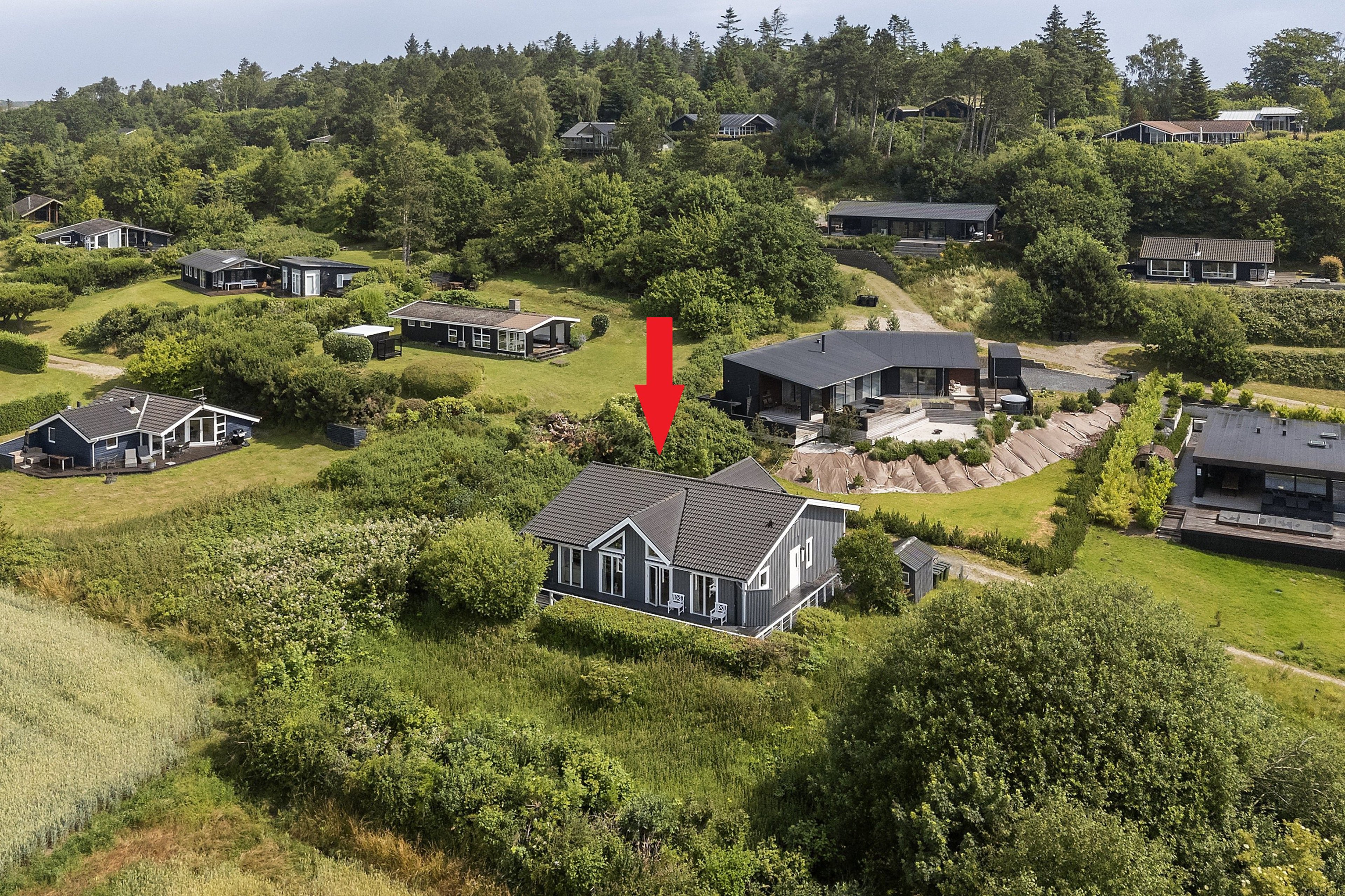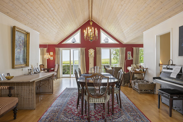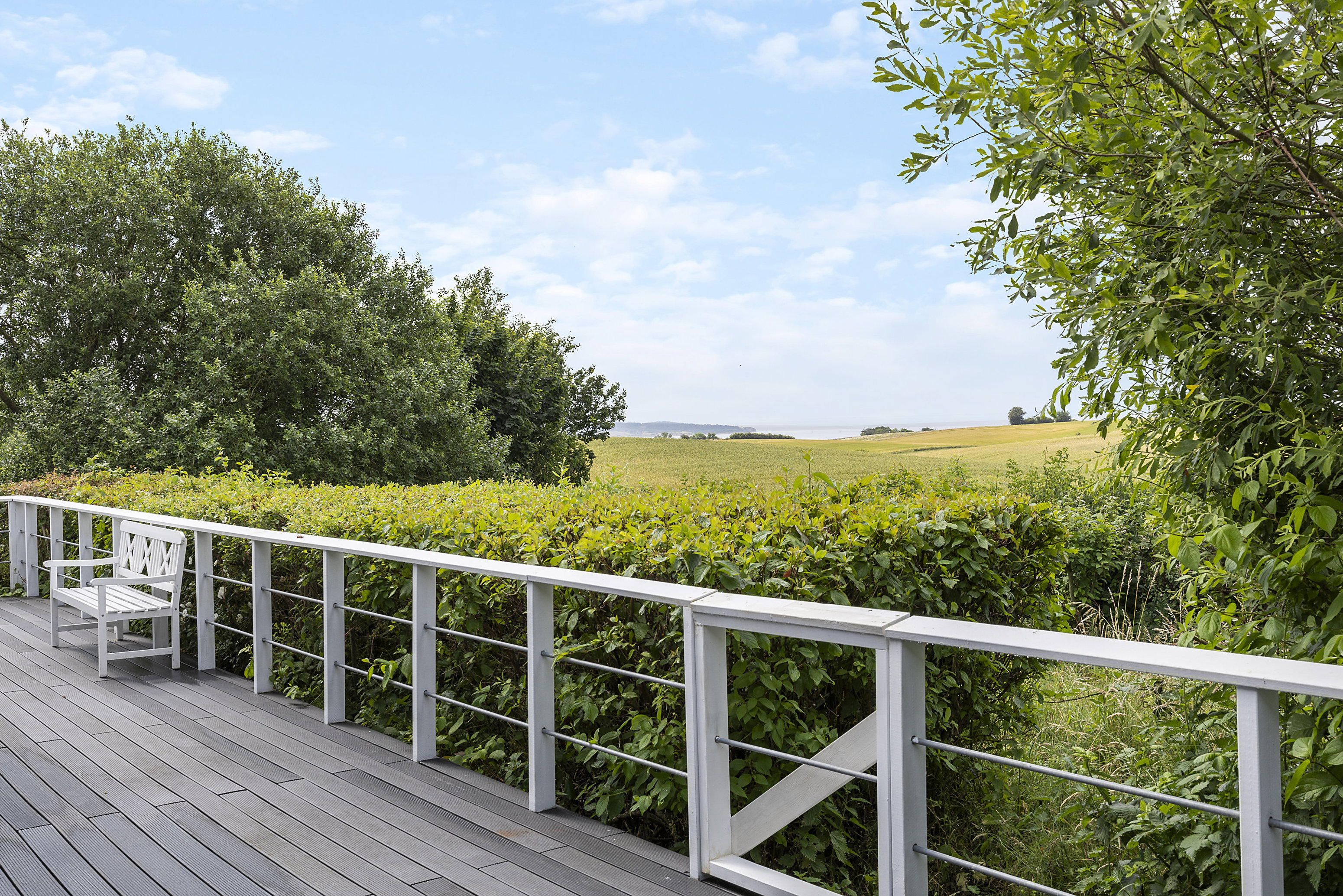 Den store grund skaber en grøn ramme om huset, hvor træterrassen smyger sig om husets syd- og vestside. Rosenbuske og frodig beplantning bidrager til stemningen, og med markerne lige over hækken er naturen jeres nærmeste nabo. Især terrassen på vestsiden af huset er fuldkommen magisk, så her mærker I husets fulde potentiale, når I nyder den uspolerede udsigt over marklandskabet til Begtrup Vig.