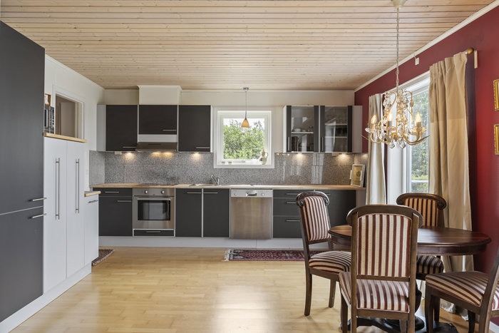 Indenfor venter hele 146 m². Der er således ualmindeligt god plads, og særligt opholdsrummene er i fokus. Køkkenet er udført med gråtonede elementer, og lyse bordplader, mens stuen ligger i åben forbindelse hertil. Loft til kip har man prioriteret for rumfornemmelsens skyld, og de store vinduespartier trækker udsigten helt ind i rummet.