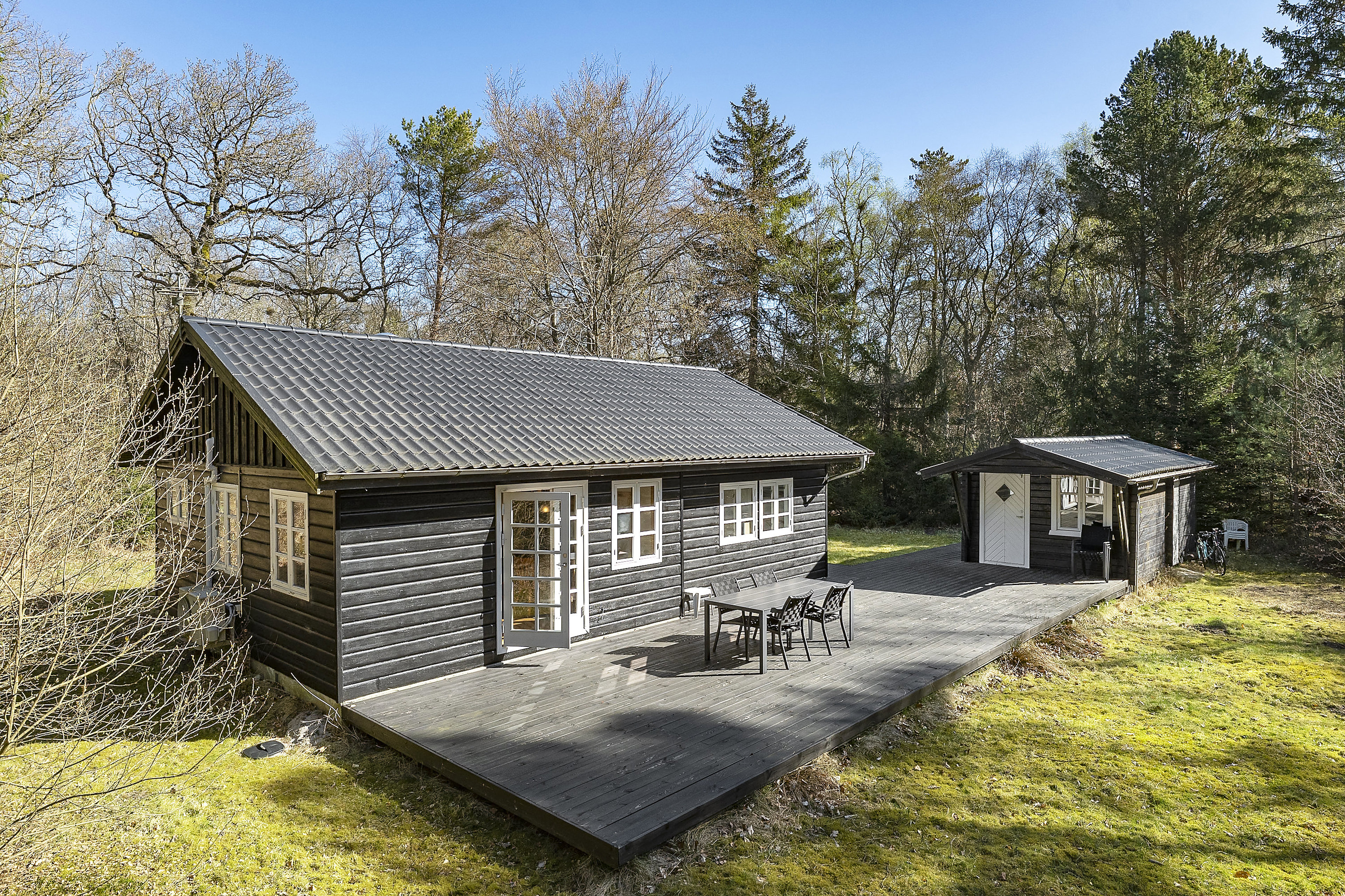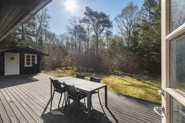 Fra alrum og stue er der direkte adgang til den store, nyere terrasse og den skønne have. Bag huset ligger skoven som en naturlig og helt privat baghave – perfekt til ro, leg og afslapning i grønne omgivelser.