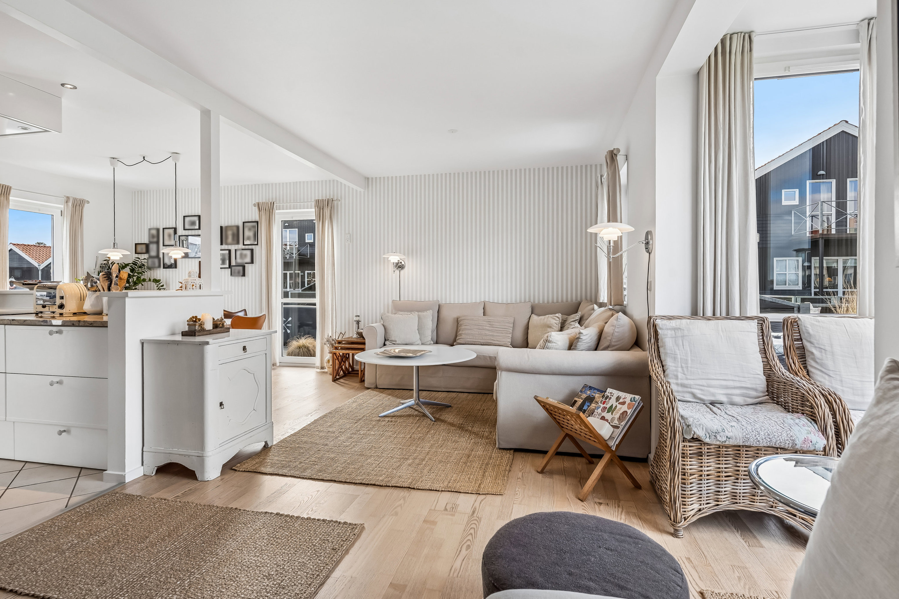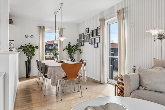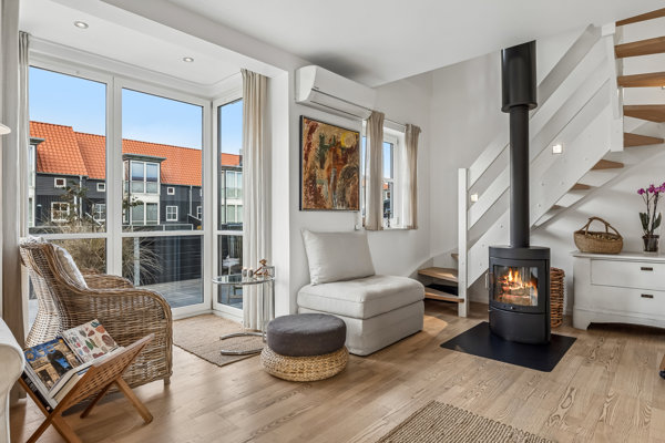 Den store træterrasse, som blev fornyet i 2021, løber rundt om huset og skaber en fantastisk ramme om udelivet med sol gennem dagen, flere hyggelige opholdszoner, elektriske markiser og terrassevarmere, så sæsonen kan strækkes langt. Her er plads til både morgenkaffen i solen, lange frokoster med familie og venner samt lune aftener med udsigt til det maritime miljø omkring huset. Indenfor fortsætter den lyse og indbydende stil, hvor flere terrassedøre lukker dagslyset smukt ind og skaber en naturlig sammenhæng mellem ude og inde. Boligen fremstår velholdt og indrettet med sans for både komfort og stemning, og de gode materialer giver helhedsindtrykket ekstra tyngde.