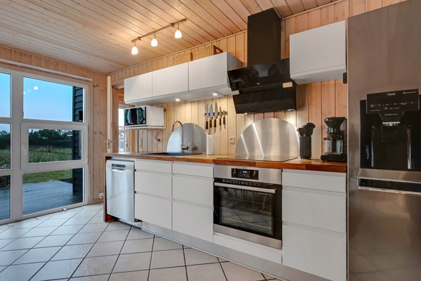 Den lyse og rummelige stue er husets hjerte – med moderne møbler, keramisk beklædt brændeovn og stereoanlæg kan I slappe af med en god bog. Det åbne køkken er fuldt udstyret til fælles madlavning og hyggelige aftener ved spisebordet.
