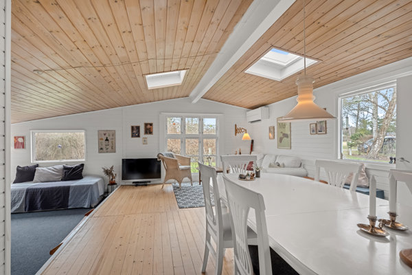 Indenfor mødes I af en lys og behagelig atmosfære. Entréen giver adgang til badeværelse med brusekabine samt et praktisk bryggers/depotrum med vaskemaskine og god opbevaringsplads. Huset rummer ét soveværelse samt en stor, lys opholdsstue i to niveauer, der naturligt samler husets liv. Varmepumpen sikrer et behageligt indeklima året rundt.