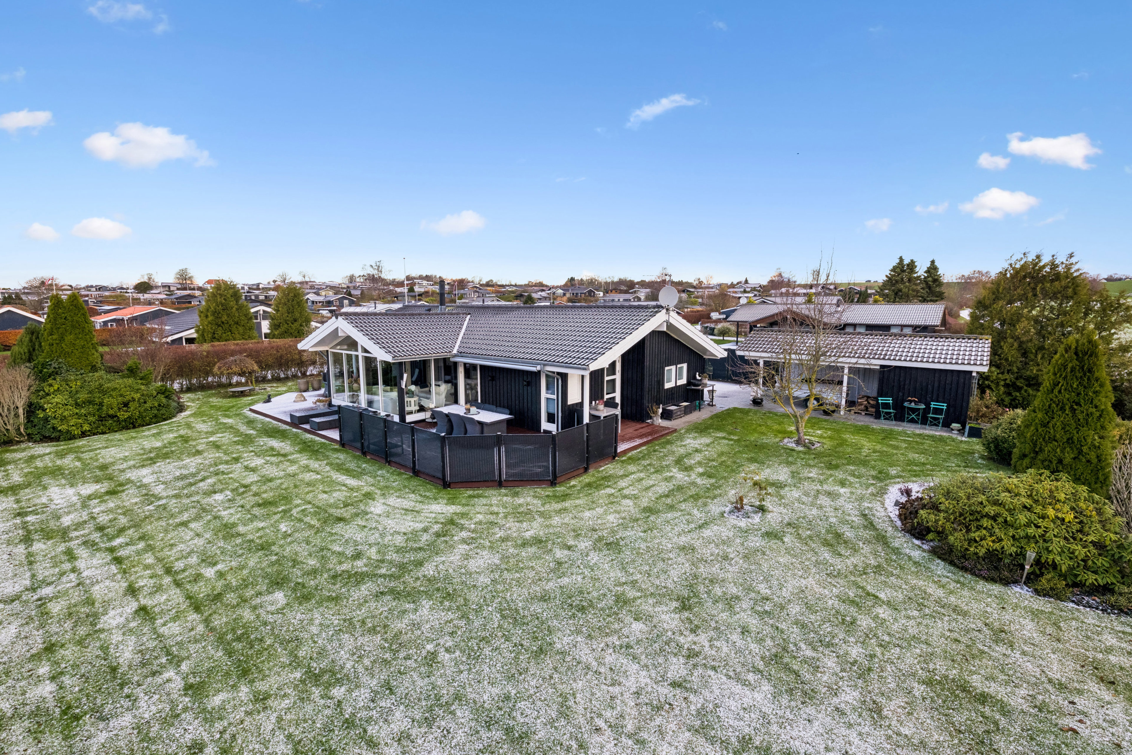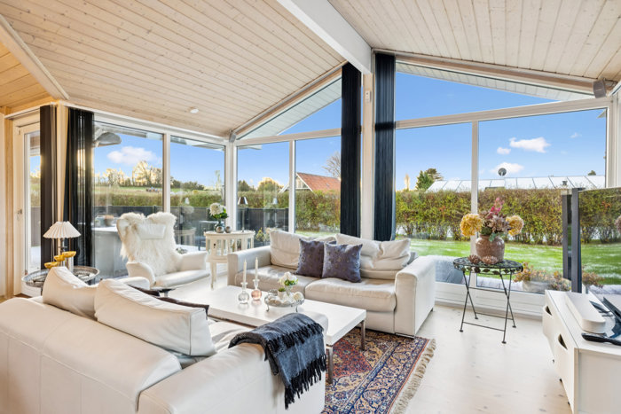 Sommerhuset fremtræder charmerende med sin sorte træfacade, der fint komplementeres af de hvide vinduesrammer og døre. Foran ejendommen har I god plads til at parkere bilen i indkørslen, og i forlængelse findes carporten med tilknyttet skur og udhus. Grunden er plan og praktisk anlagt, så I med god samvittighed kan læne jer tilbage på træterrassen, der breder sig om tre af boligens sider. Den vestvendte del er tilmed overdækket, hvilket giver gode betingelser for at blive siddende ude selv de sene aftentimer.