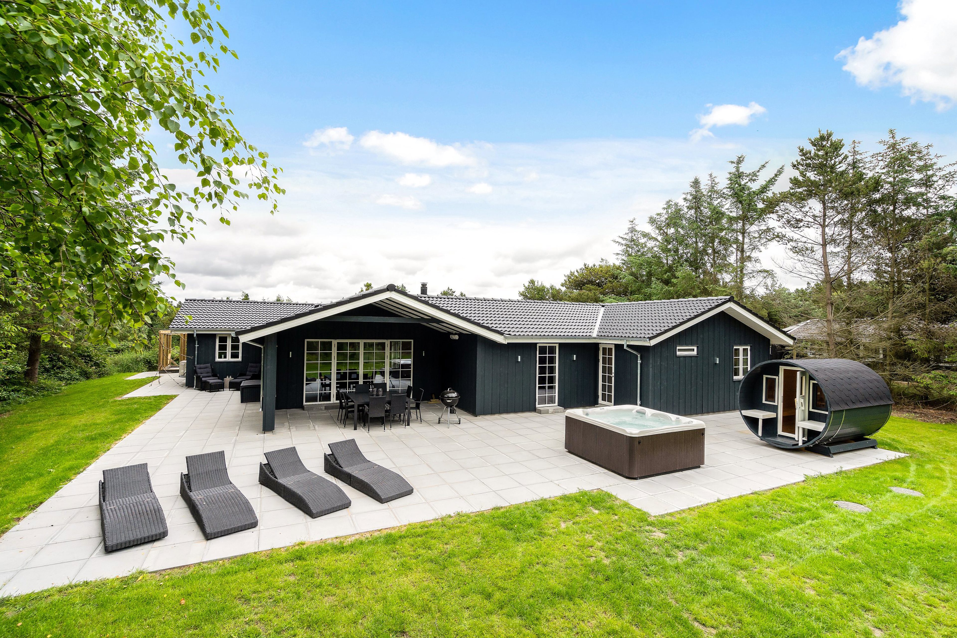 Udendørs fortsætter oplevelsen på den store, delvist overdækkede terrasse, der er skabt til afslapning og samvær. Komfortable havemøbler, liggestole og grill danner rammen om lange sommeraftener, mens det udendørs spabad inviterer til rene wellness-stunder under åben himmel. Forestil jer at synke ned i det varme vand efter en dag ved stranden, mens solen går ned over området. Lige ved terrassen finder I desuden en stemningsfuld saunahytte, som fuldender følelsen af luksus.