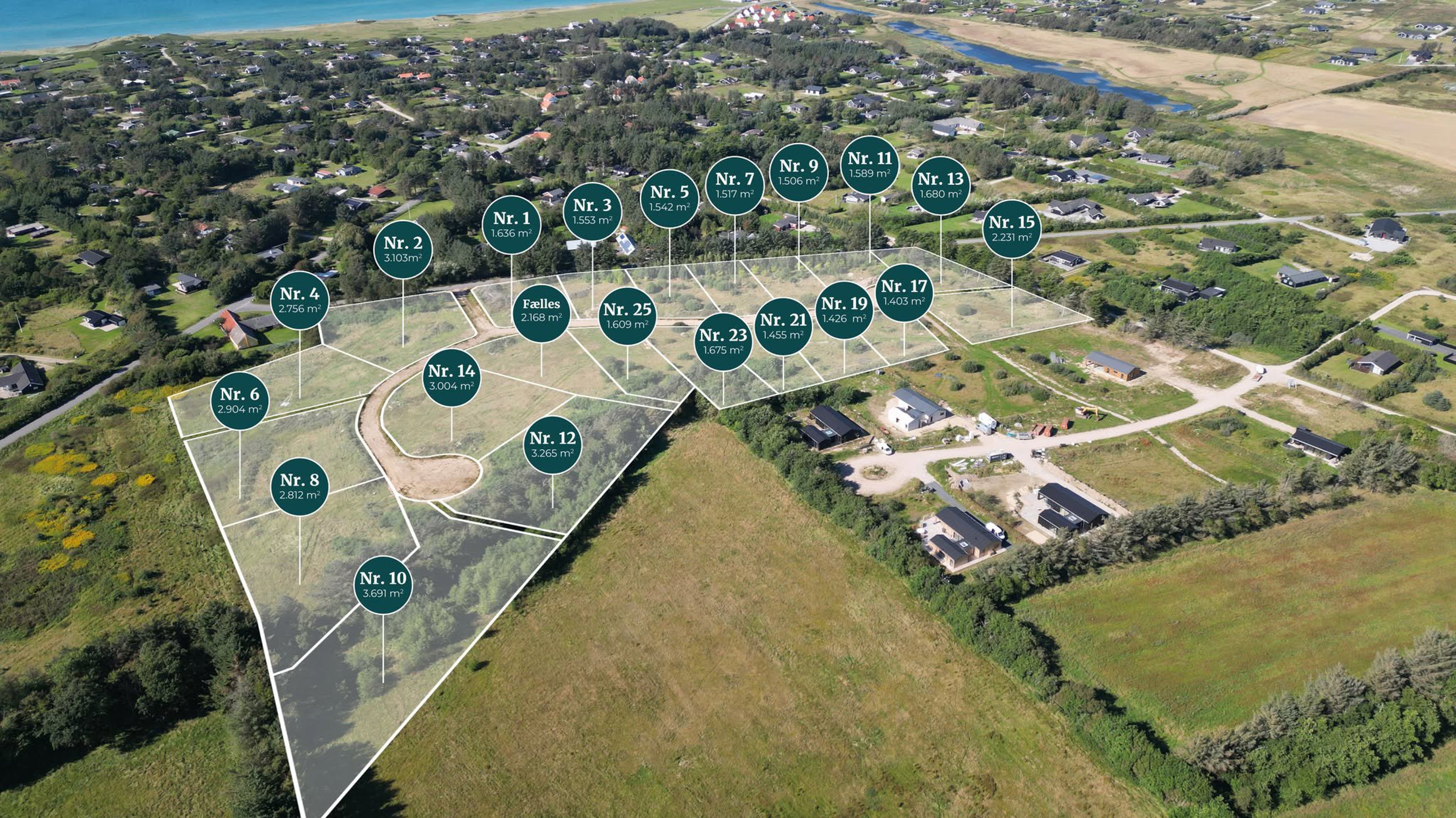 Grundene er på 1.403 – 3.691 m² og der er etableret indkørsel ind til hver grund.