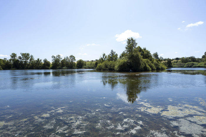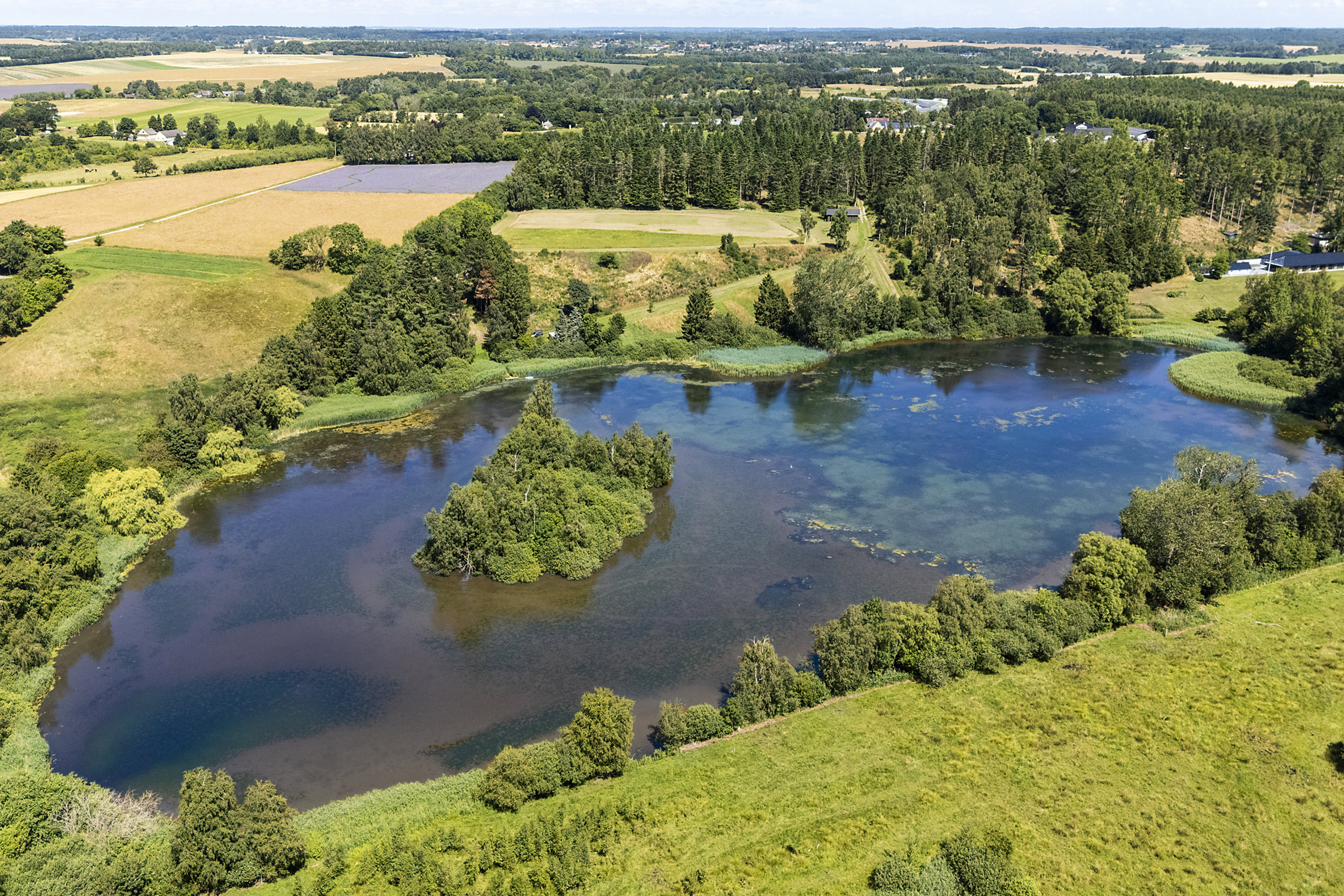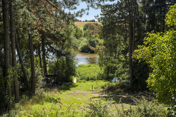Grunden byder på naturskønne omgivelser, der folder sig ud omkring en fredfyldt sø med siv, træer og charmerende lille ø. Det højere liggende plateau, hvor det tidligere hus lå, giver den perfekte placering til at opføre et hus med smuk udsigt over vandet – og her er byggemodnet allerede klargjort med strøm, vand og rensningsanlæg, så du kan komme i gang med projektet uden unødige forhindringer